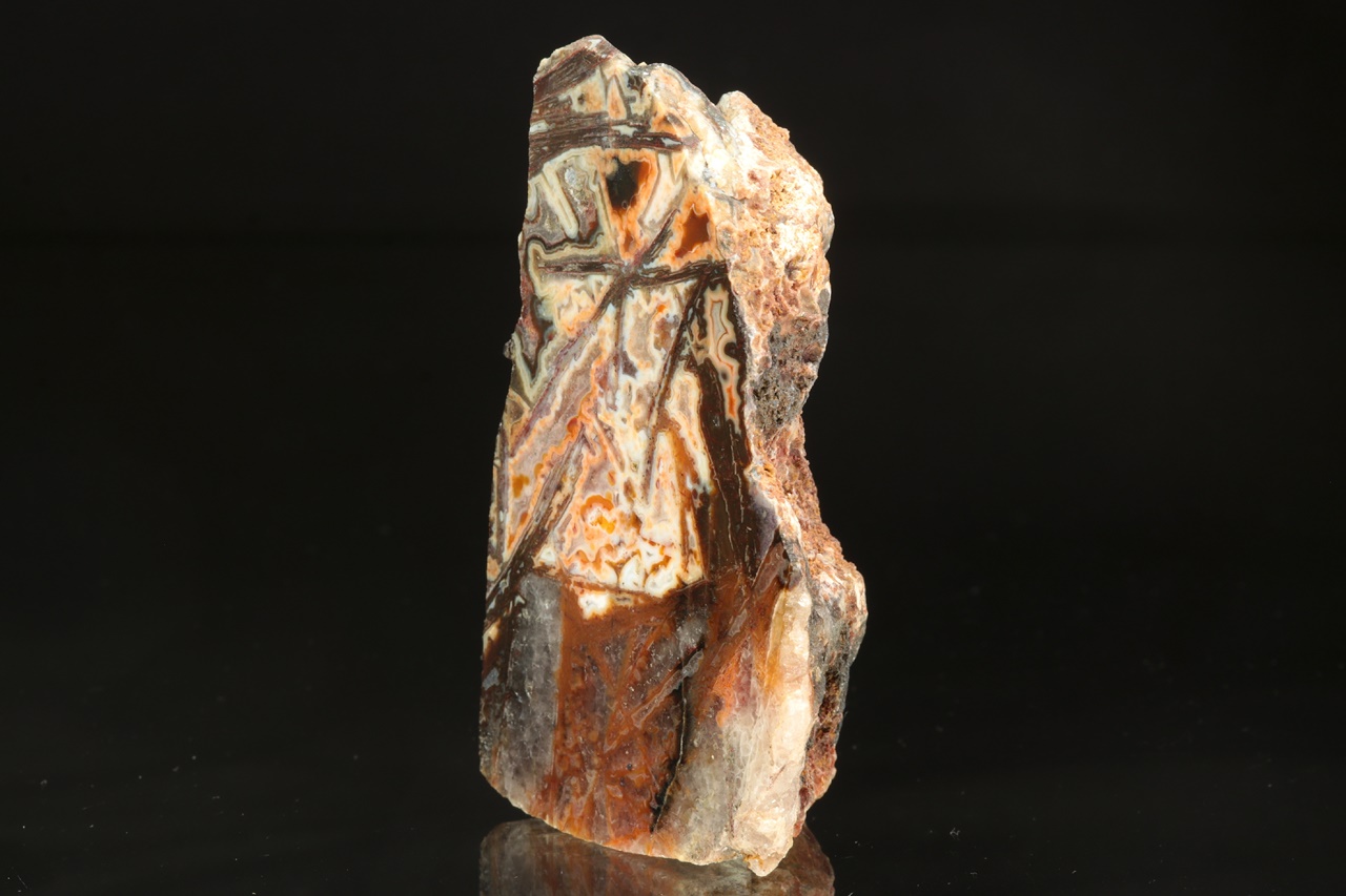 Bílo černo oranžový, leštěný achát s texturou s protáhlými žilkami.