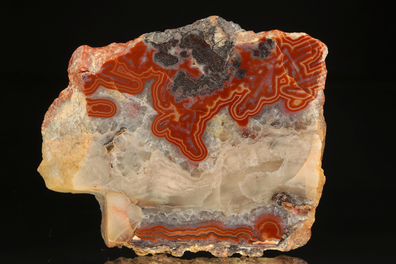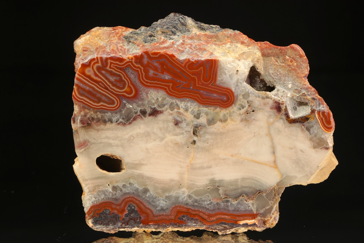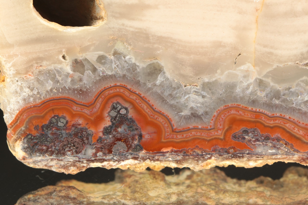 Oboustranně leštěný vzorek achátu s křemenným středem a nádhernou červenou „krajkou“ na okraji z vyhlášené krušnohorské lokality.