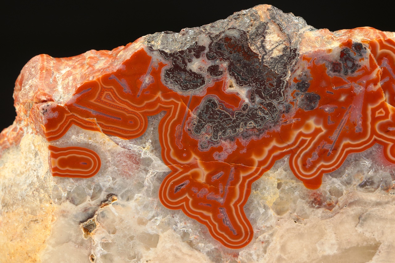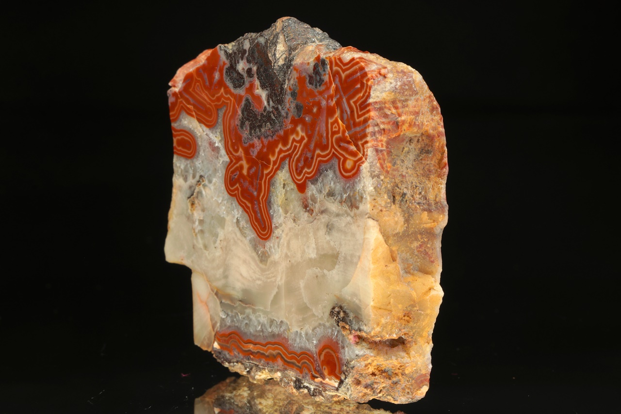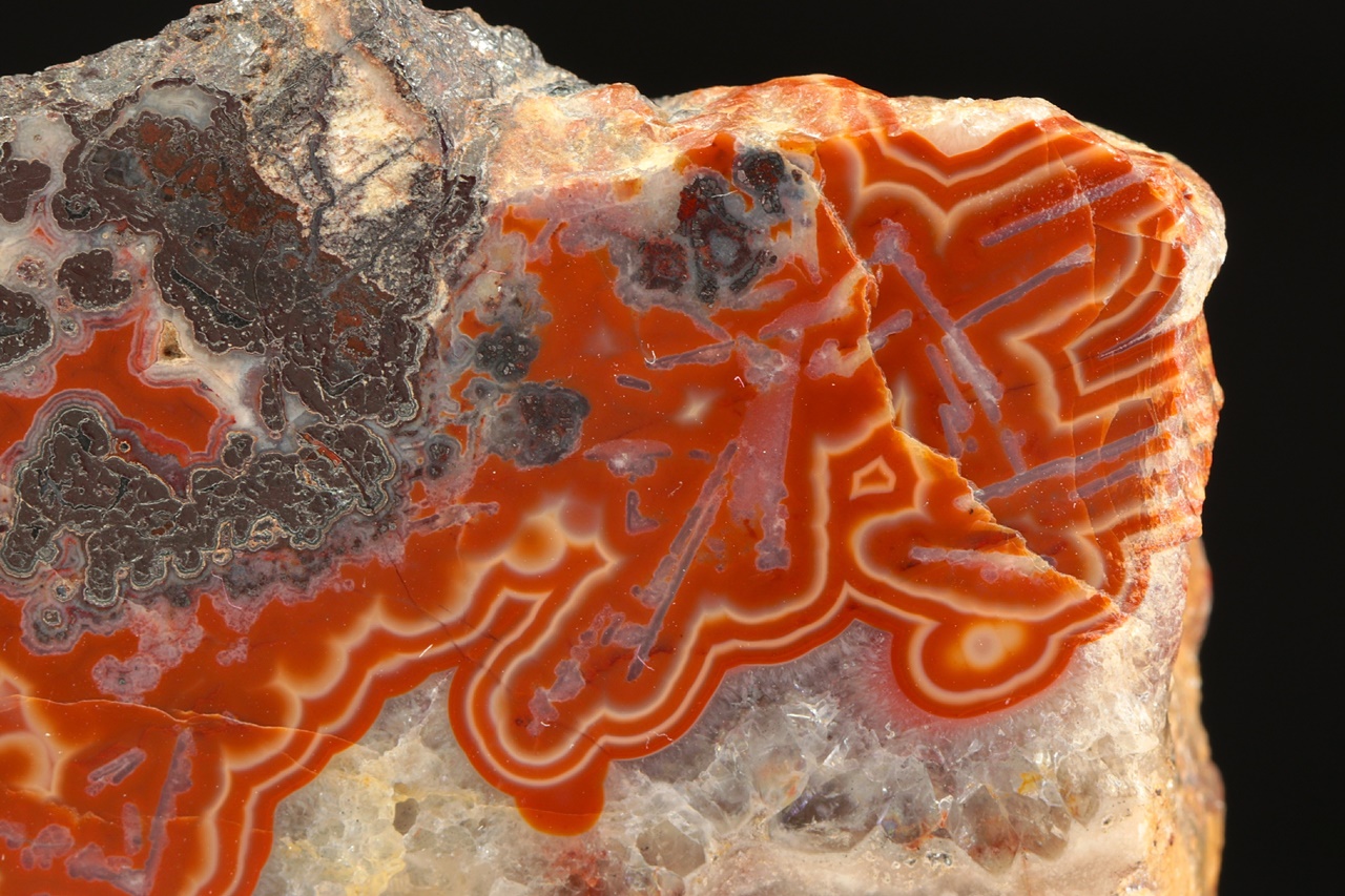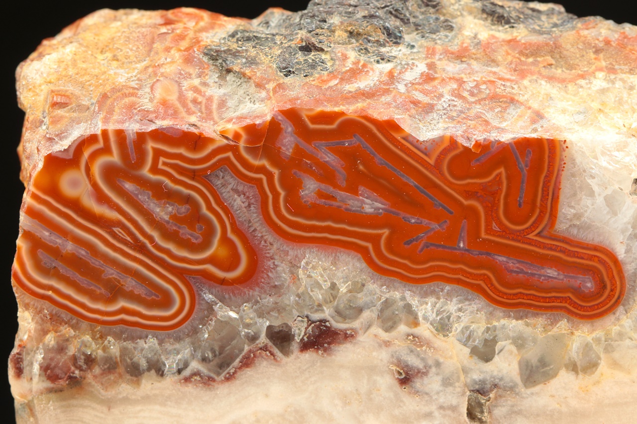 Oboustranně leštěný vzorek achátu s křemenným středem a nádhernou červenou „krajkou“ na okraji z vyhlášené krušnohorské lokality.