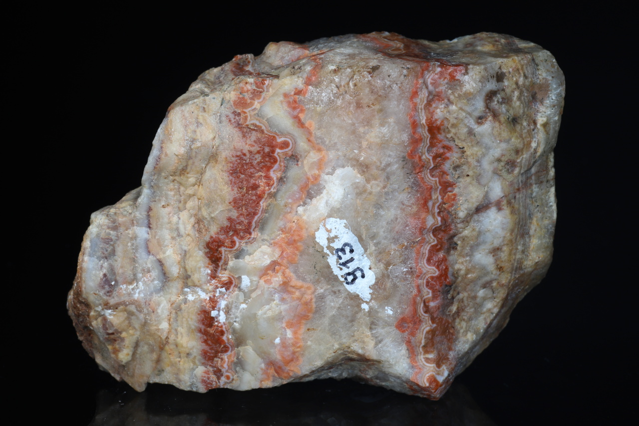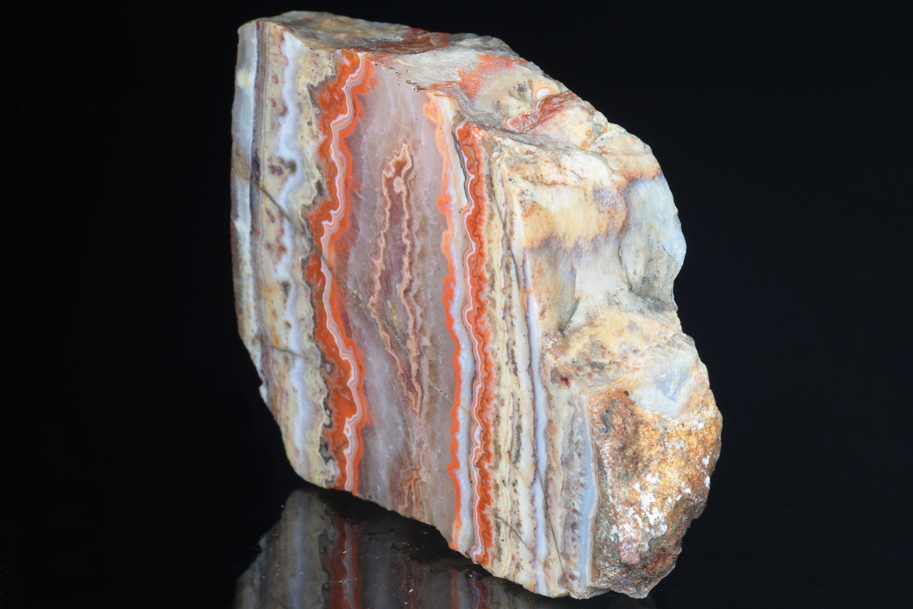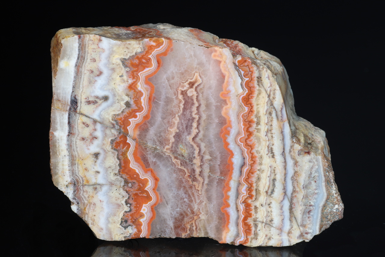 Z jedné strany leštěný vzorek achátu s velmi pěknou výraznou kresbou z naleziště Černý Potok v Krušných Horách.