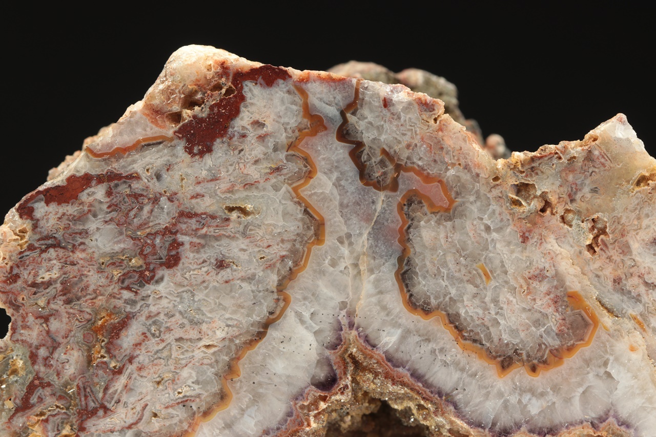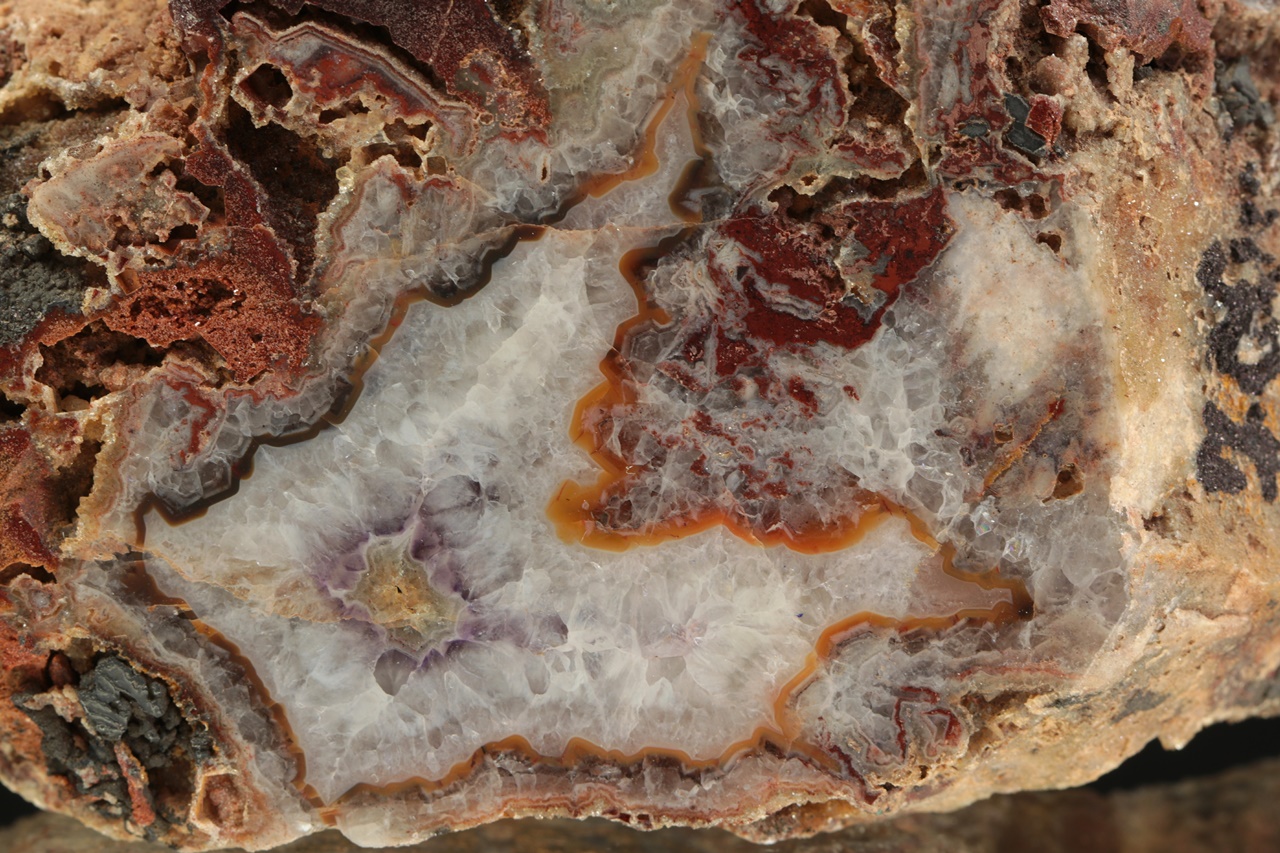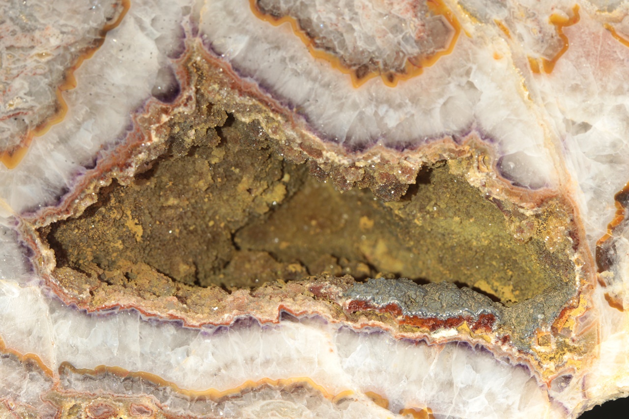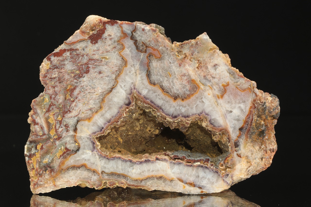 Oboustranně leštěný vzorek pestře zbarveného achátu s křemennou dutinou o rozměrech 7 × 3 cm.