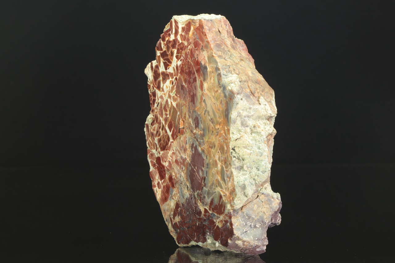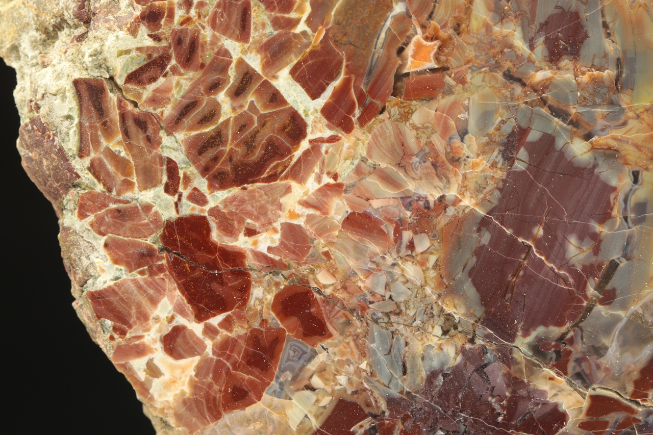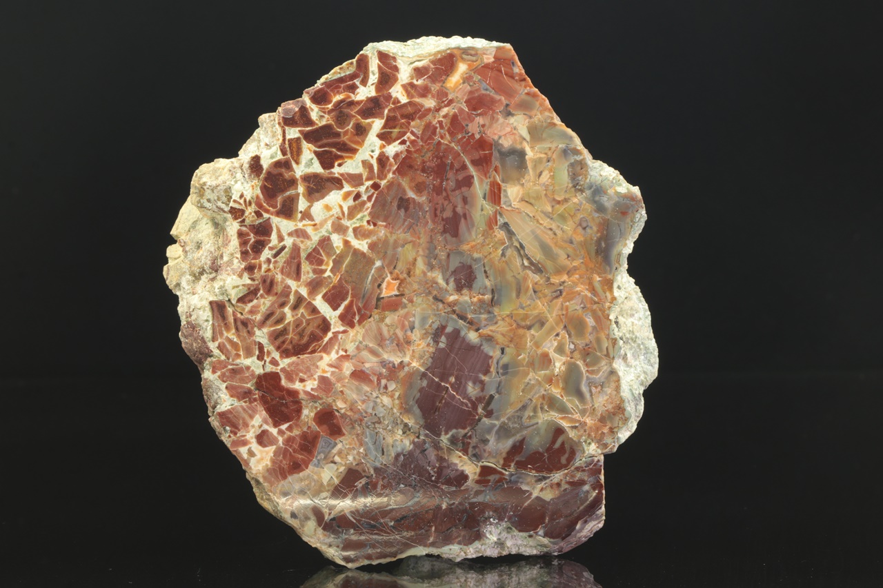 Leštěný vzorek hnědo červené brekcie stmelené achátem.