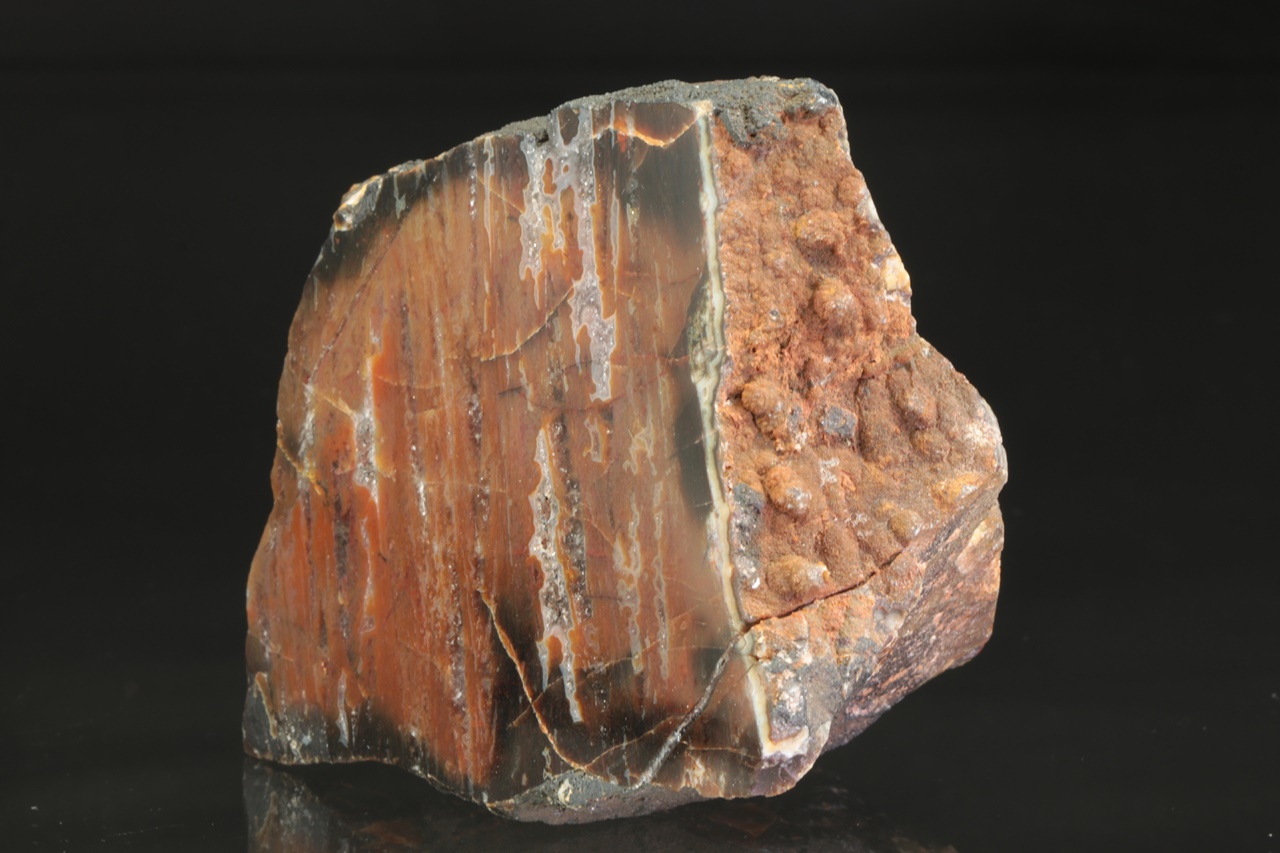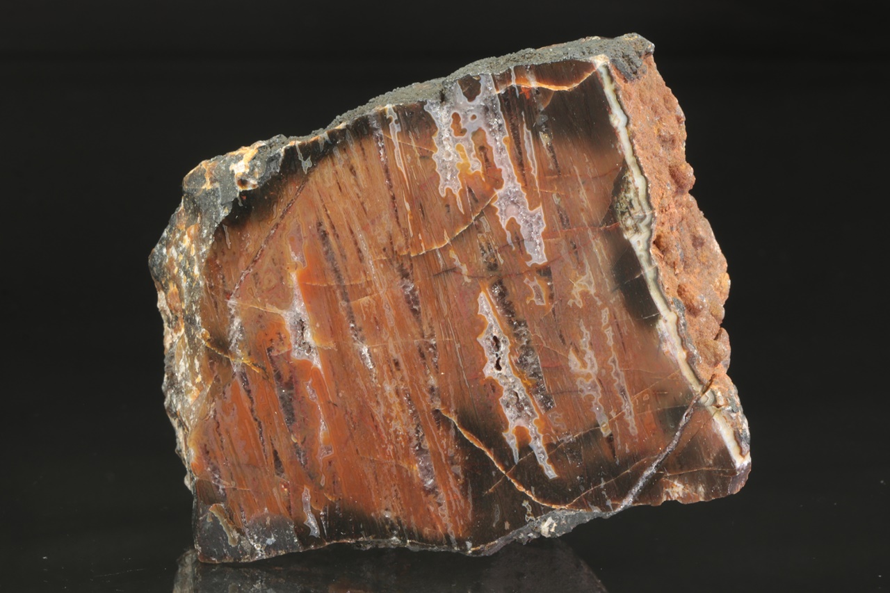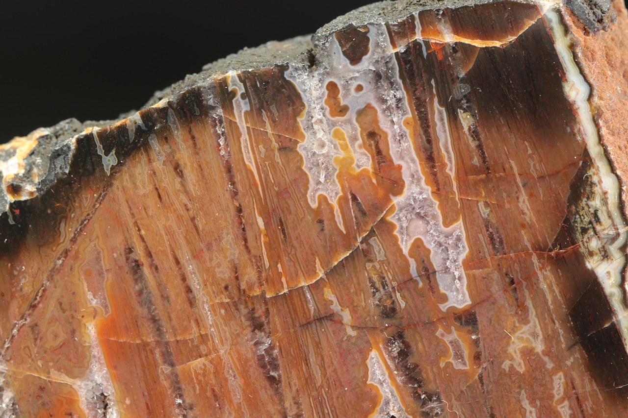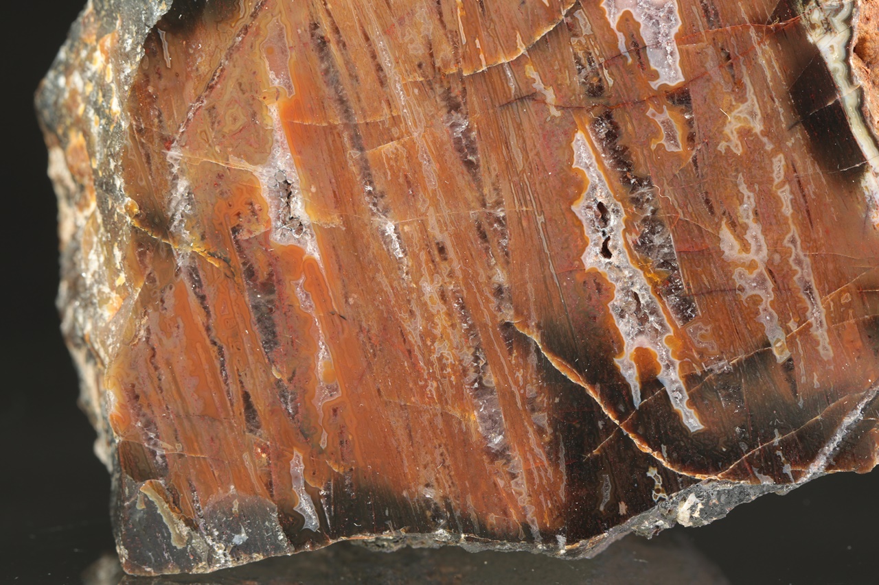 Leštěný vzorek achátu z tzv. Černé Halže s výraznými červenými pruhy.