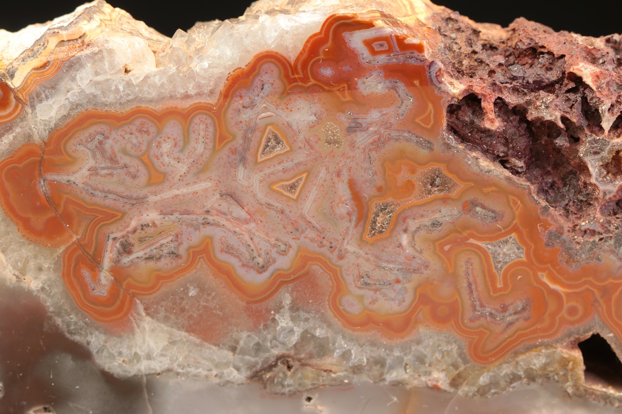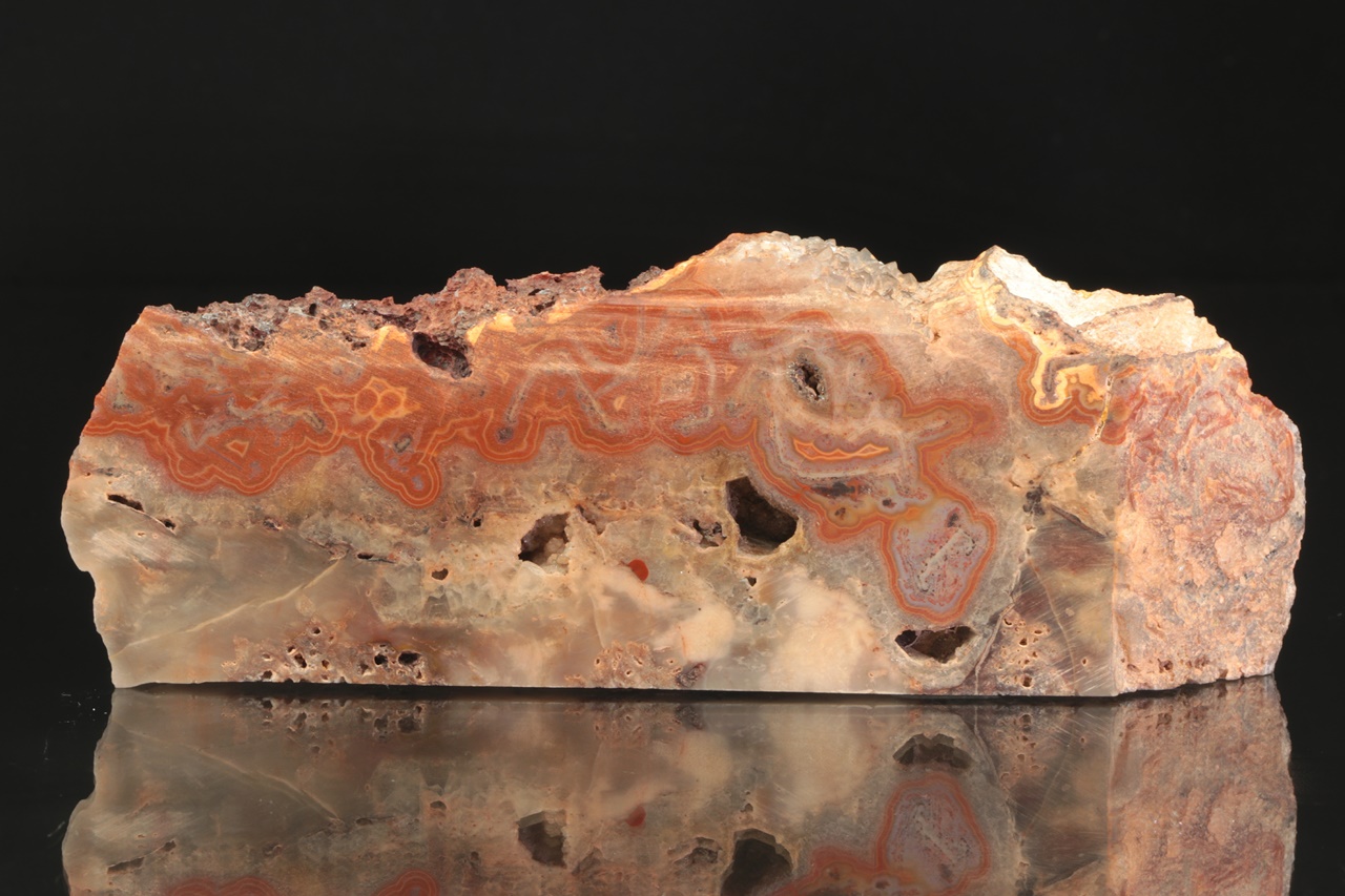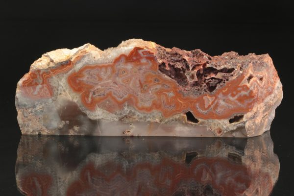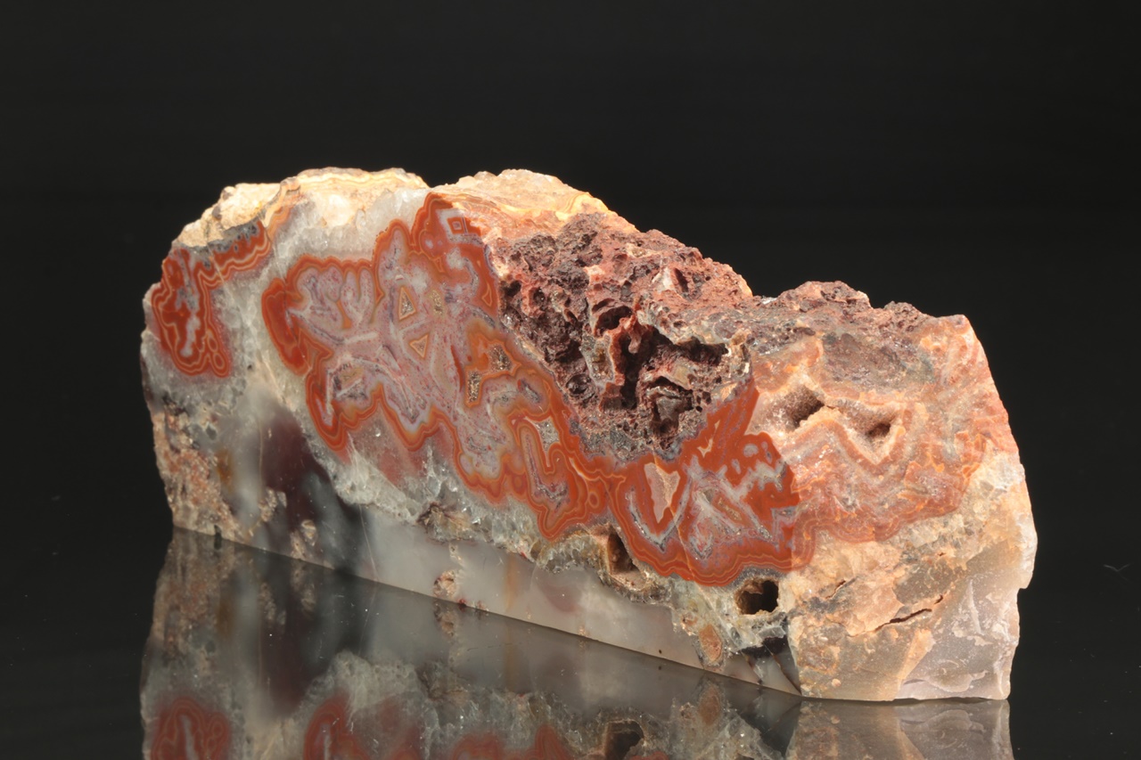 Nádherná ukázka achátu s nádhernou červenou kresbou ze známé krušnohorské lokality. Vzorek je ze zadní strany a zespodu seřízly.