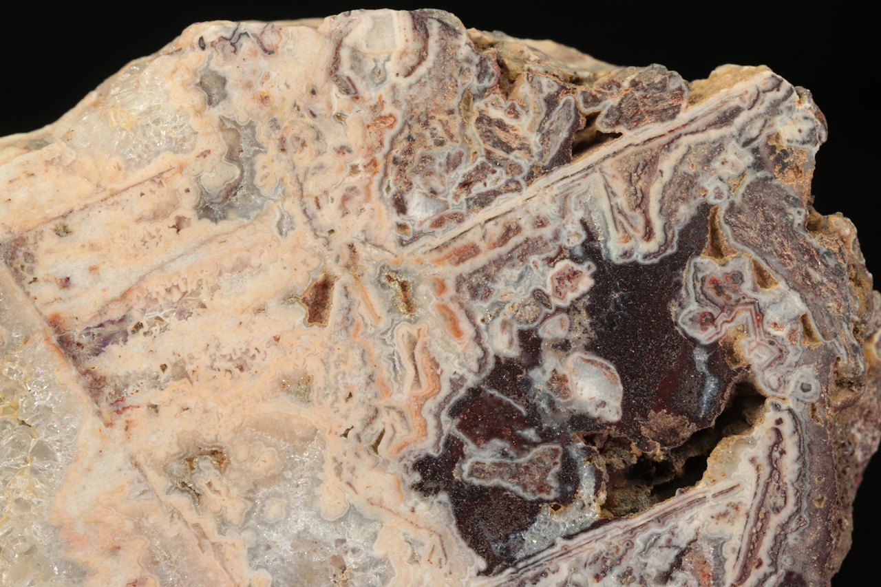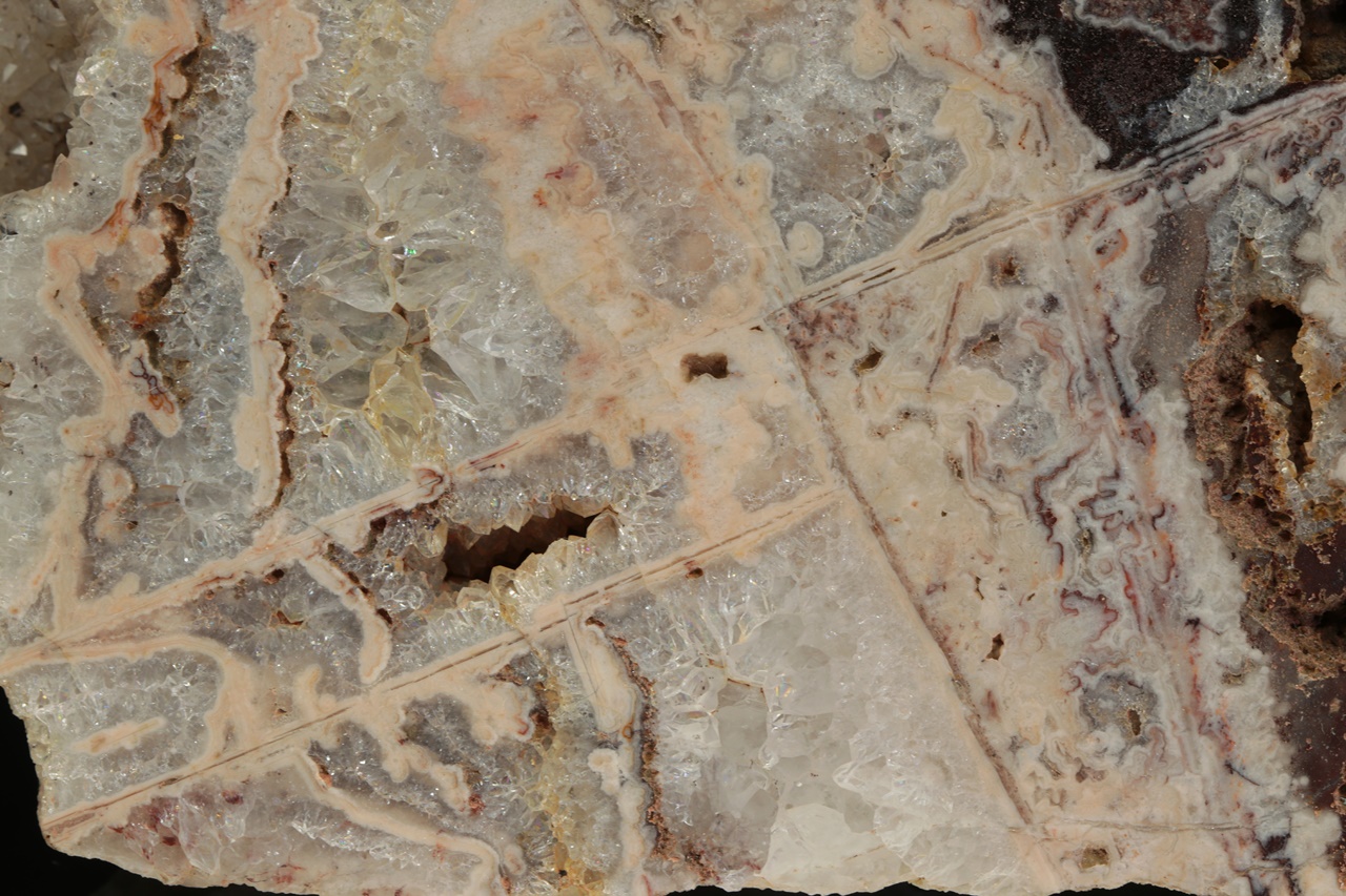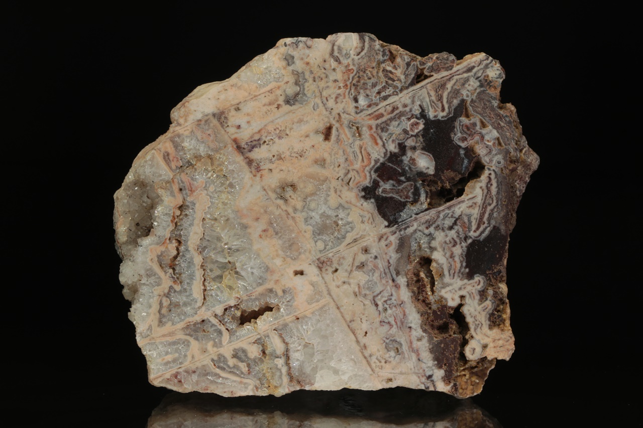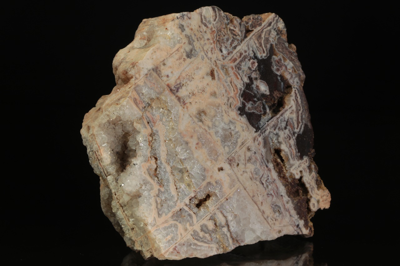Leštěný vzorek světle růžového achátu tvořícího perimorfózy po lištovitých minerálech s krystalickým křemenem.