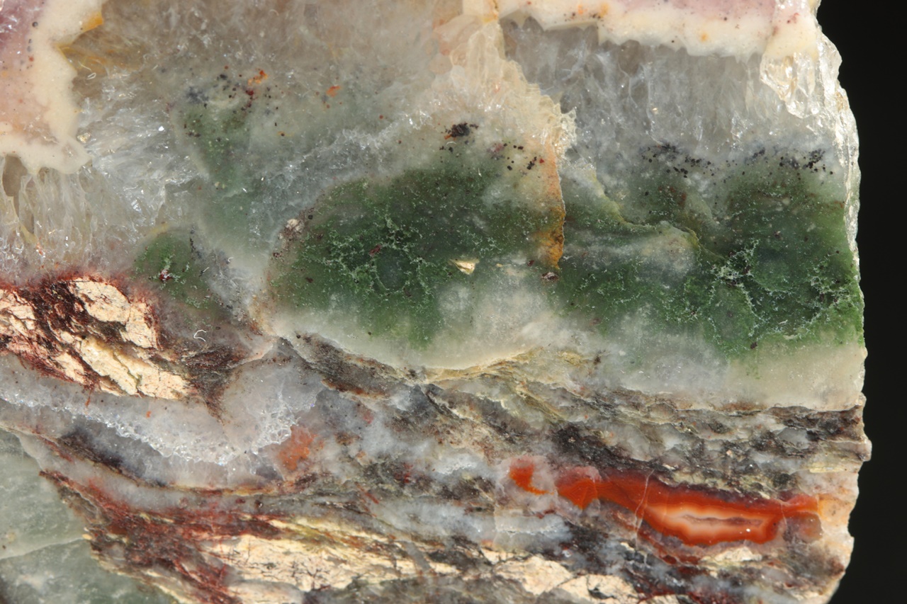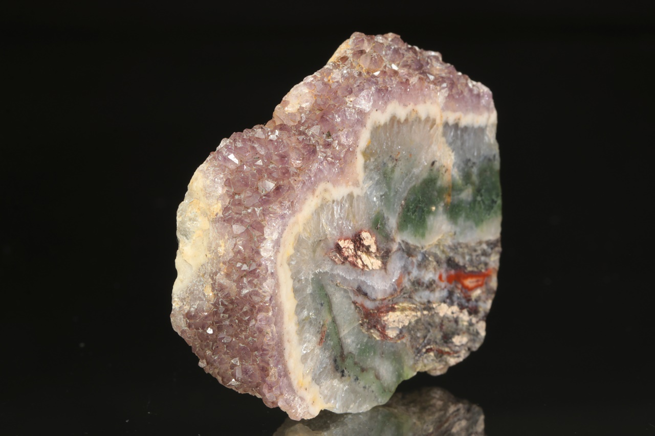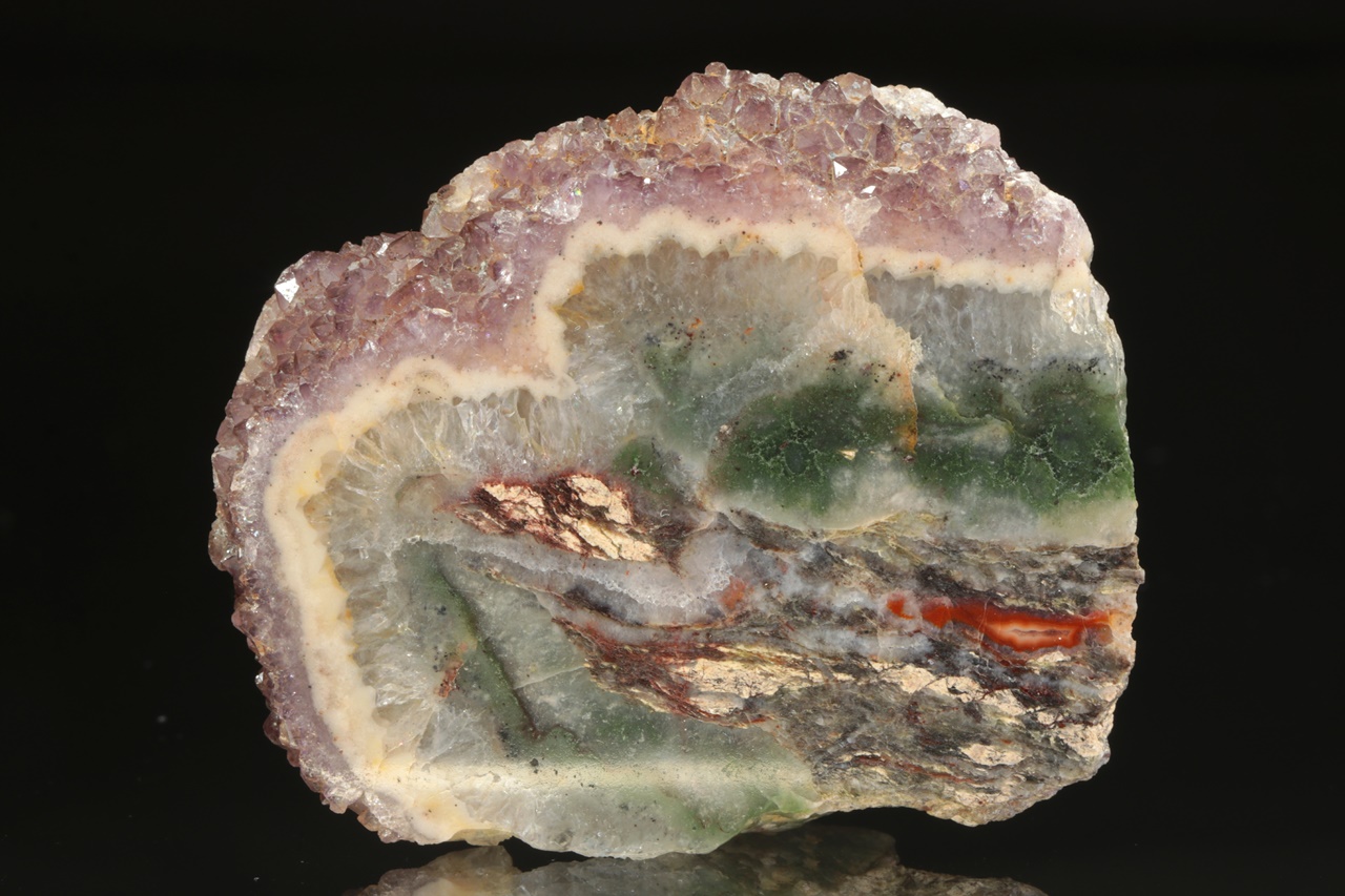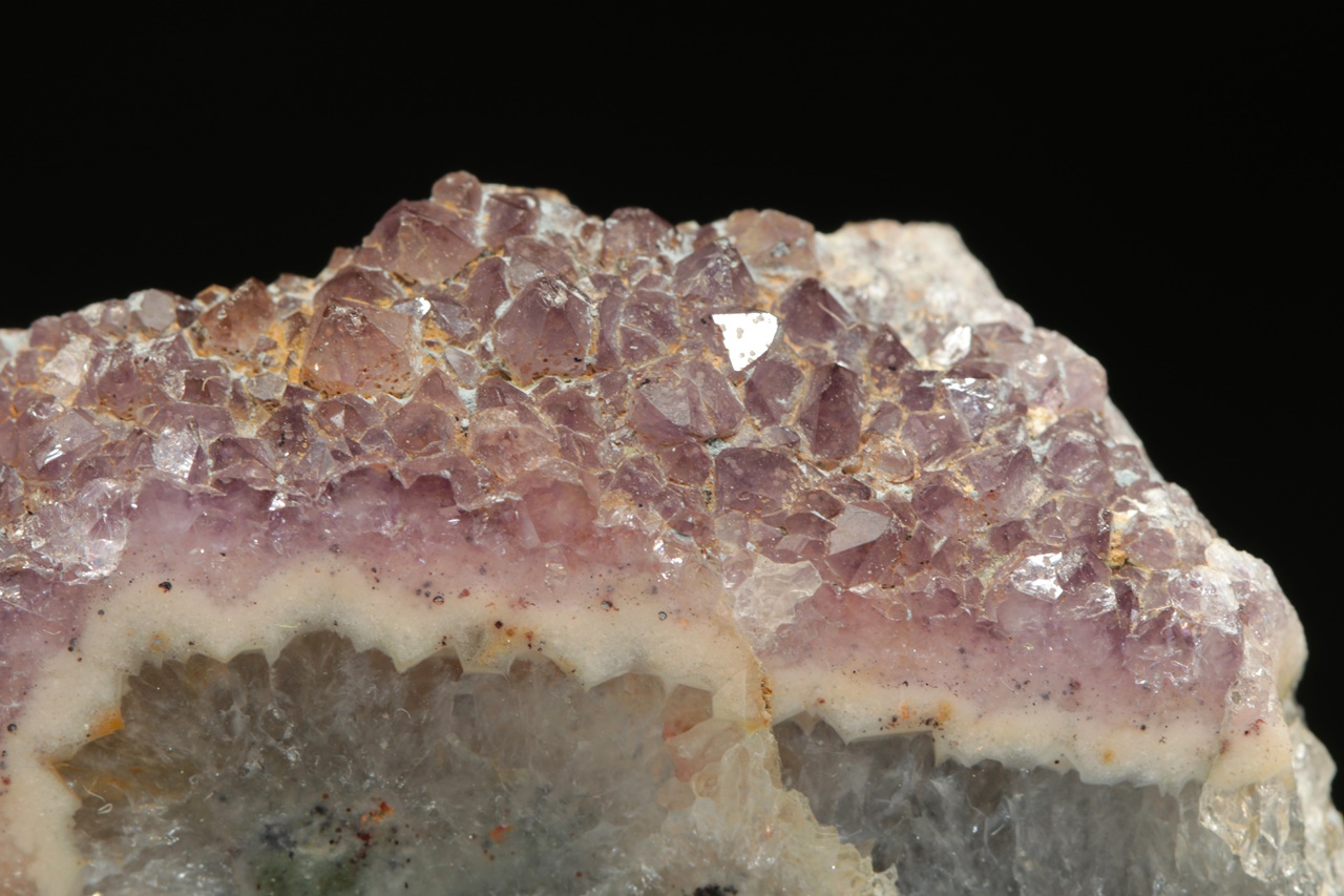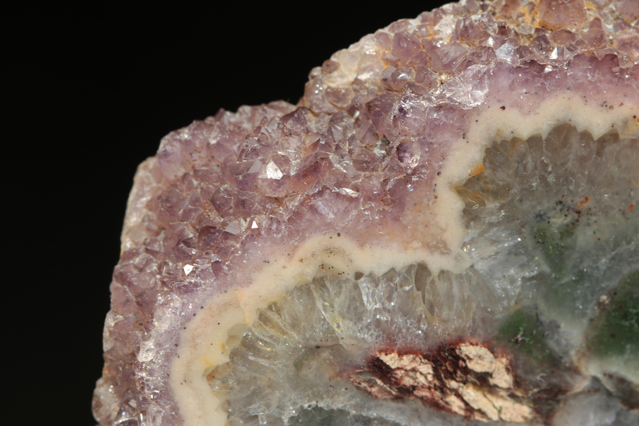 Pseudomorfóza achátu po kalcitových krystalech porostlá krystaly ametystu.