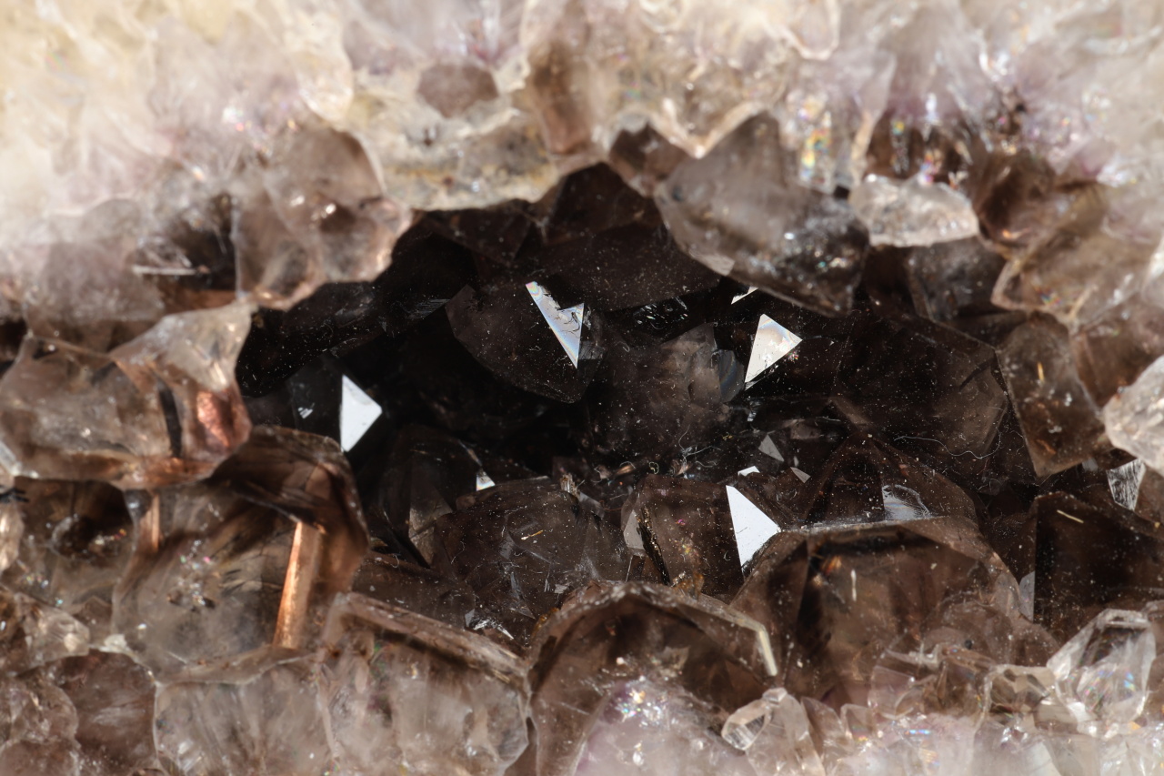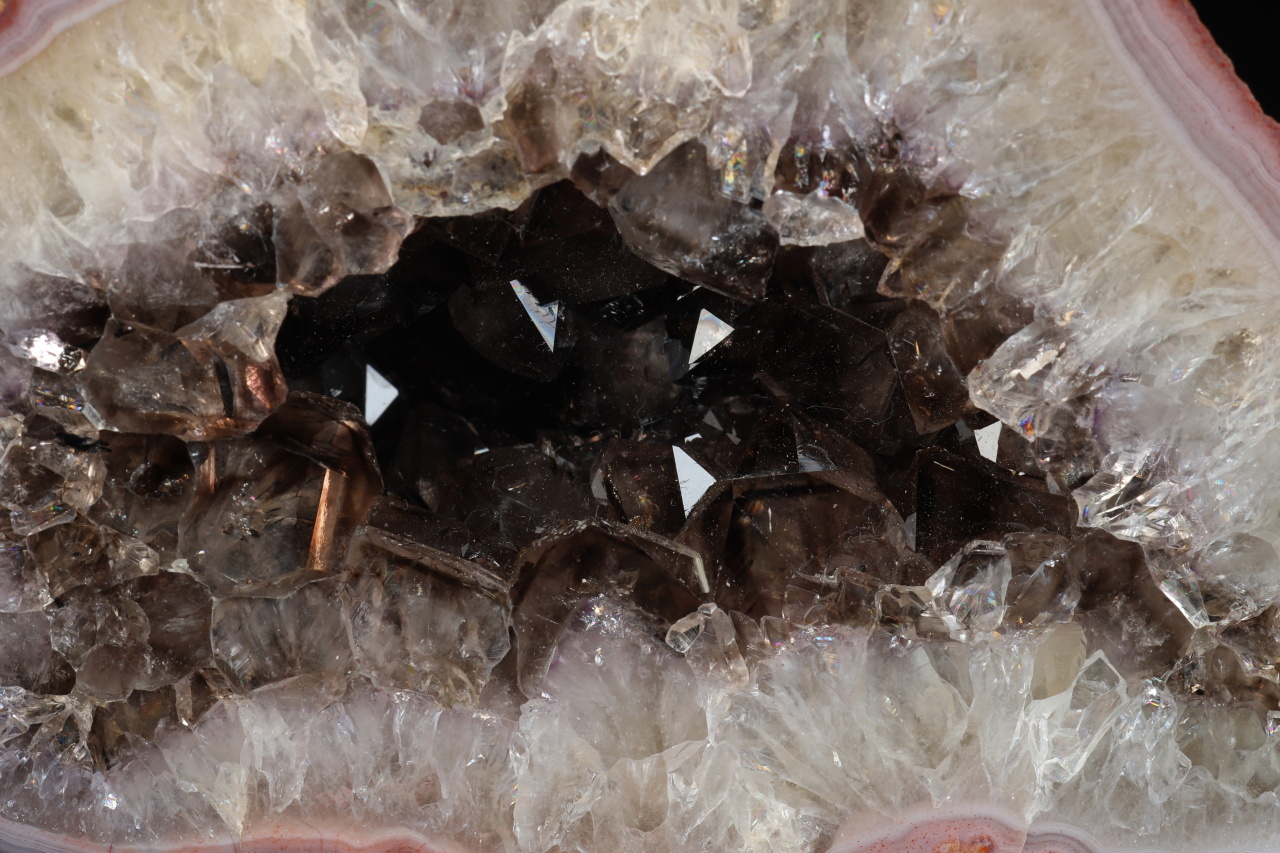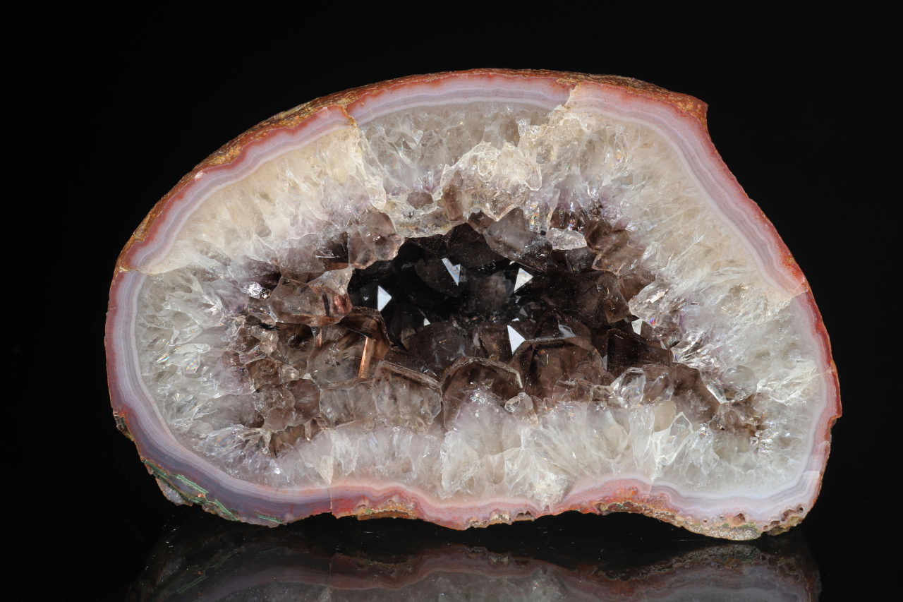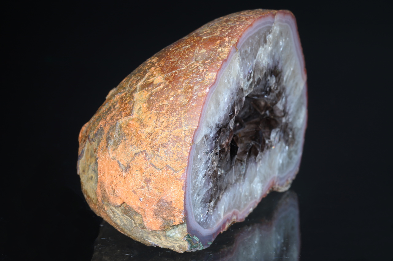 Velmi pěkná ukázka kompletní leštěné poloviny geody s tenkým achátovým lemem, který přechází v křišťál a krystaly záhnědy do dutiny. Vzorek pochází ze slavného naleziště Rašovka u Liberce.