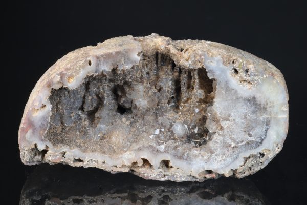 Zajímavá ukázka leštěné poloviny pecky se světlým achátovým lemem a krystaly a krápníkovitými útvary křemene do dutiny z naleziště Rašovka u Liberce.