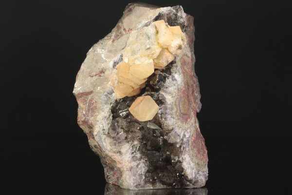 Masivní achát ukončený dutinou s krystaly záhnědy, na které narůstají prismatické krystaly kalcitu až 2,5 cm velké.