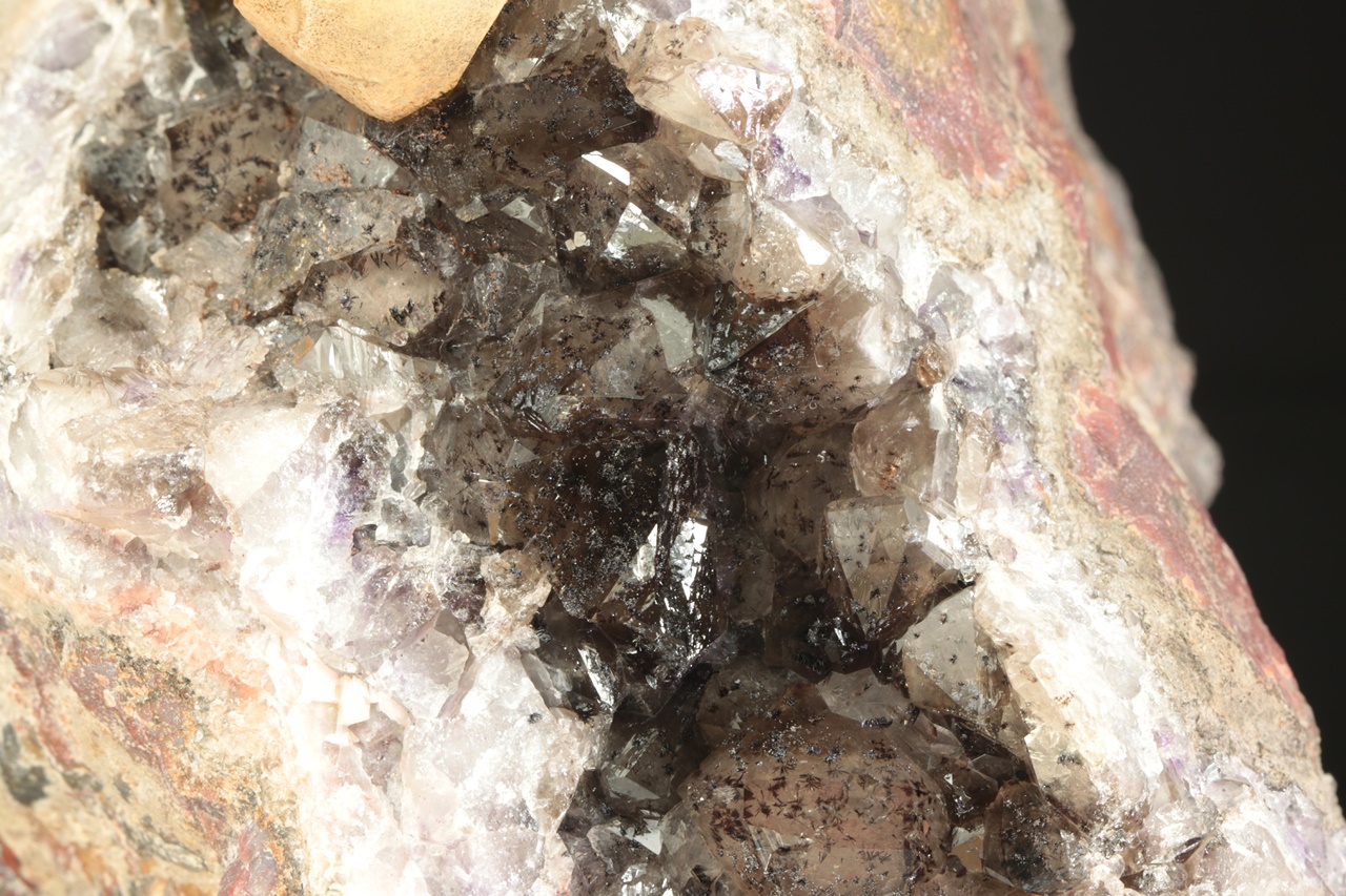 Masivní achát ukončený dutinou s krystaly záhnědy, na které narůstají prismatické krystaly kalcitu až 2,5 cm velké.