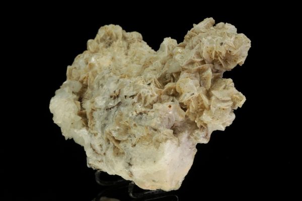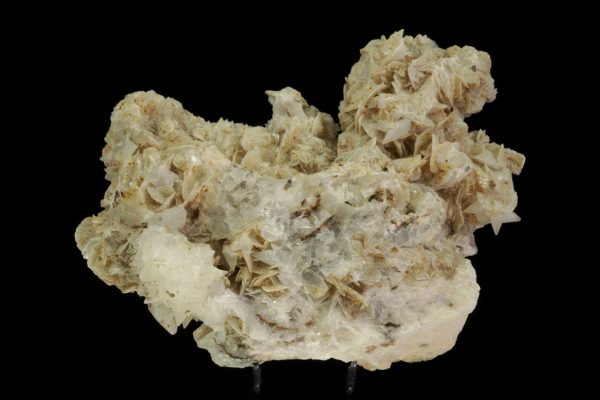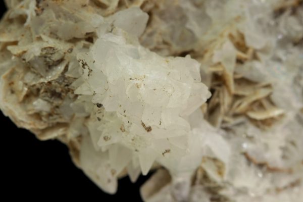 Špičaté krystaly bílého alstonitu narostlé na béžovém tabulárním kalcitu. Velikost shluku krystalů alstonitu je 2 × 1 cm. Vzorek pochází z typové lokality.