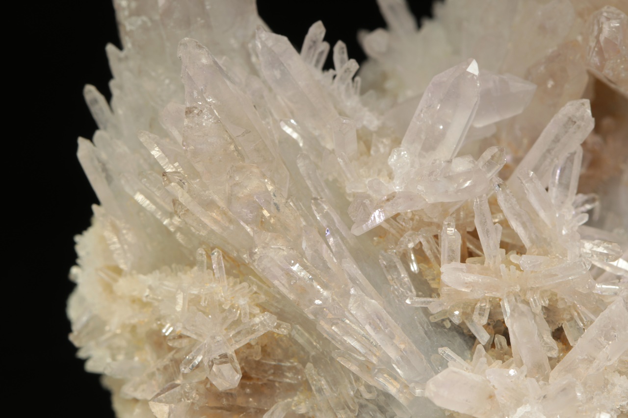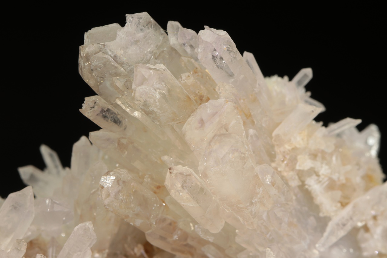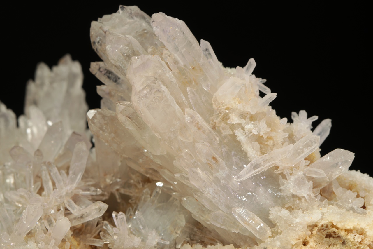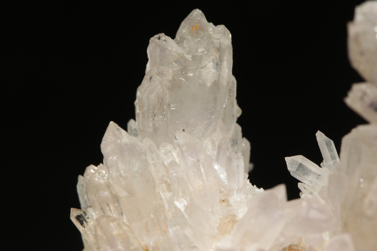 Protáhlé krystaly světlého ametystu tvořící trsy okolo většího centrálního krystalu. Vzorek pochází ze žíly Bieber. Větší trs v pravé části vzorku je 5 cm dlouhý.