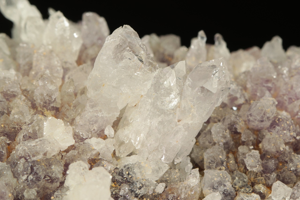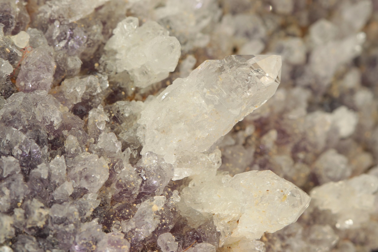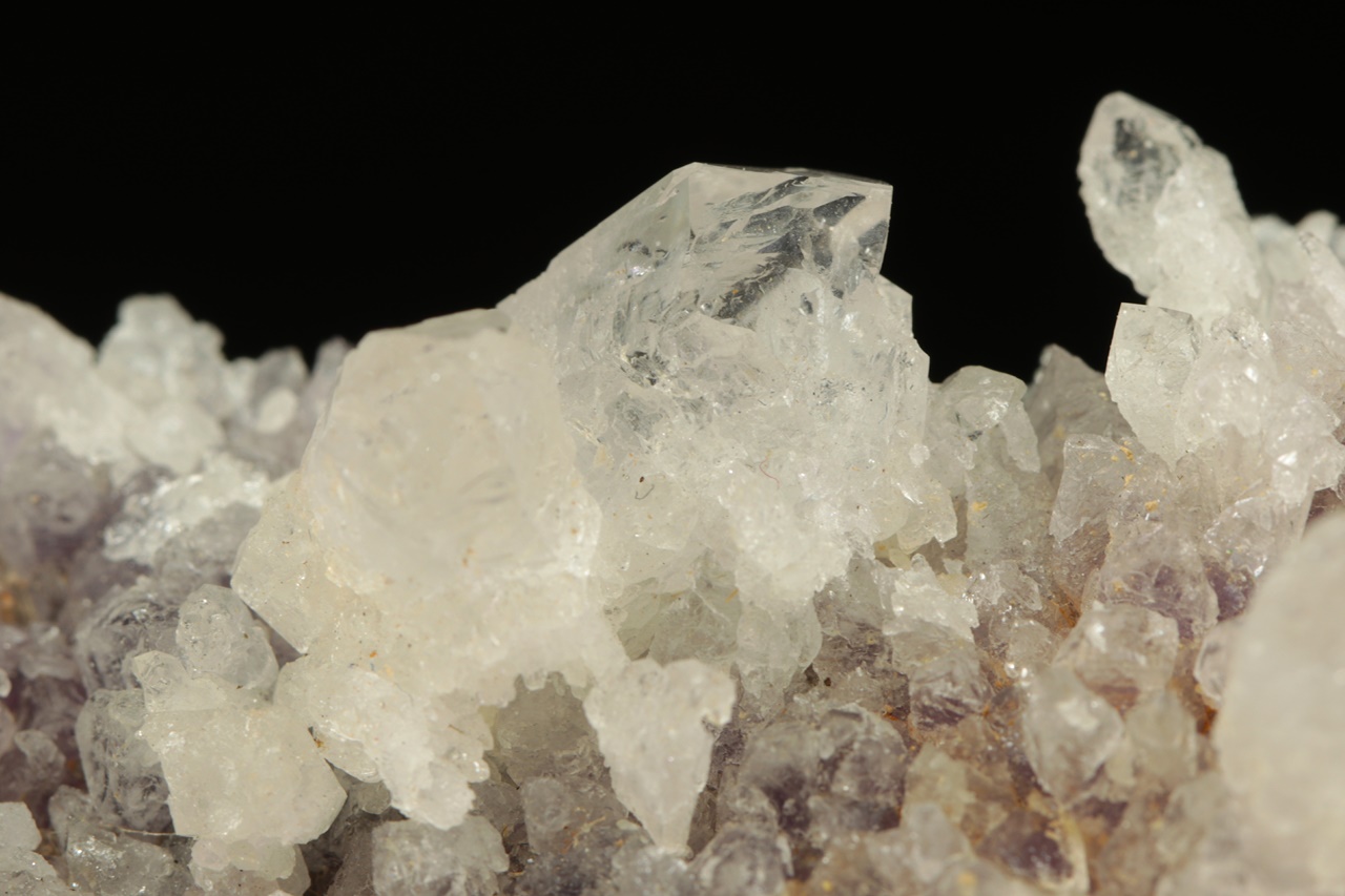 Až dva centimetry velké křišťály narůstající na starší ametystovou drúzu.