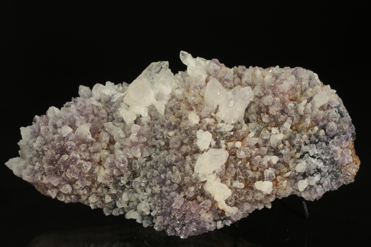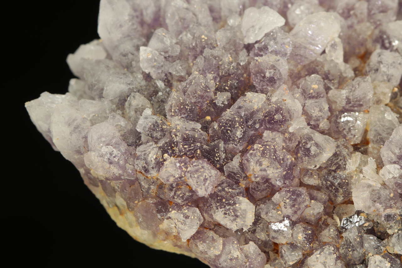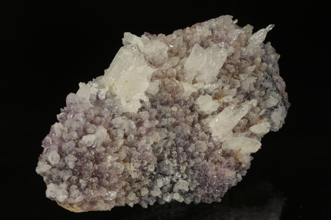 Až dva centimetry velké křišťály narůstající na starší ametystovou drúzu.