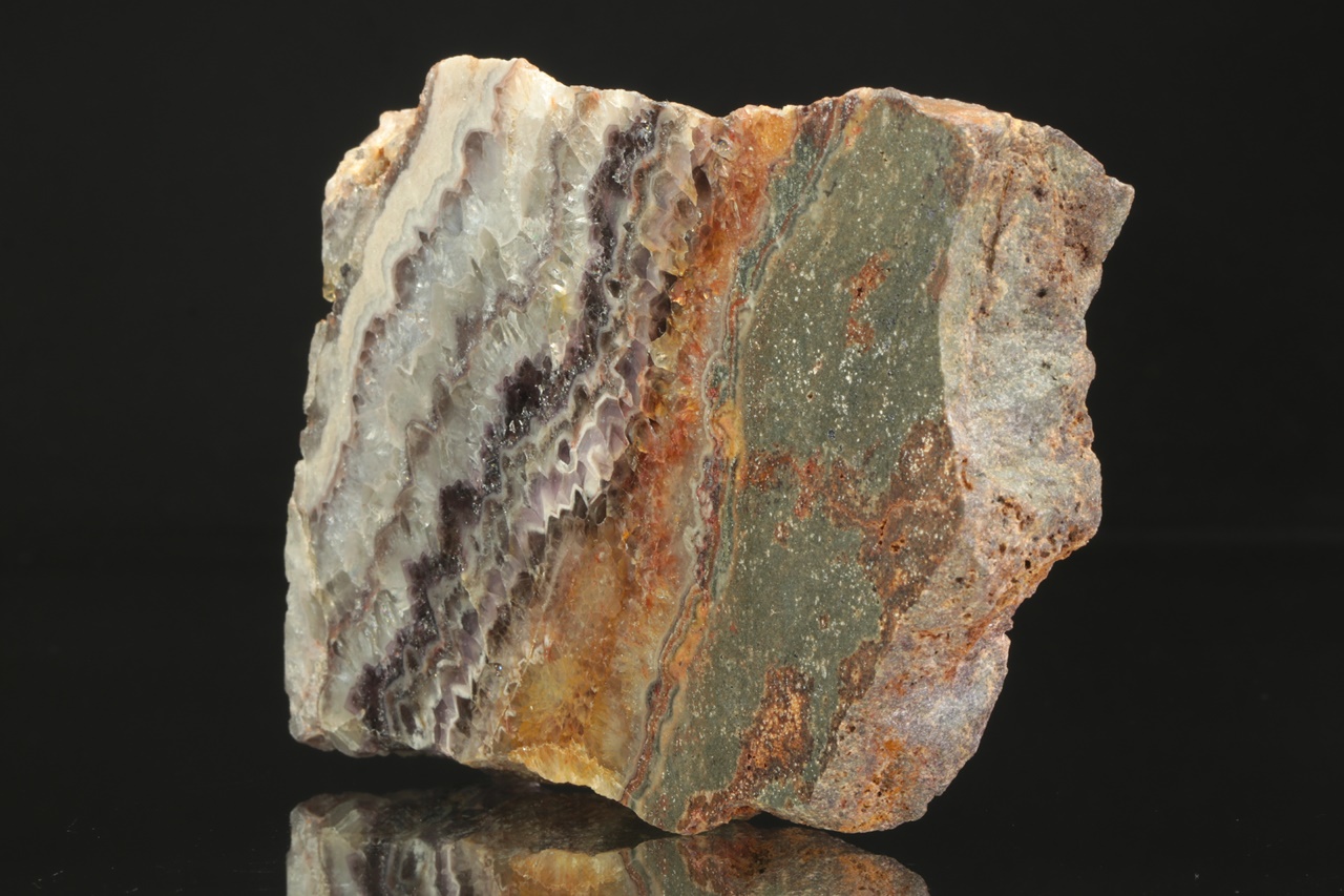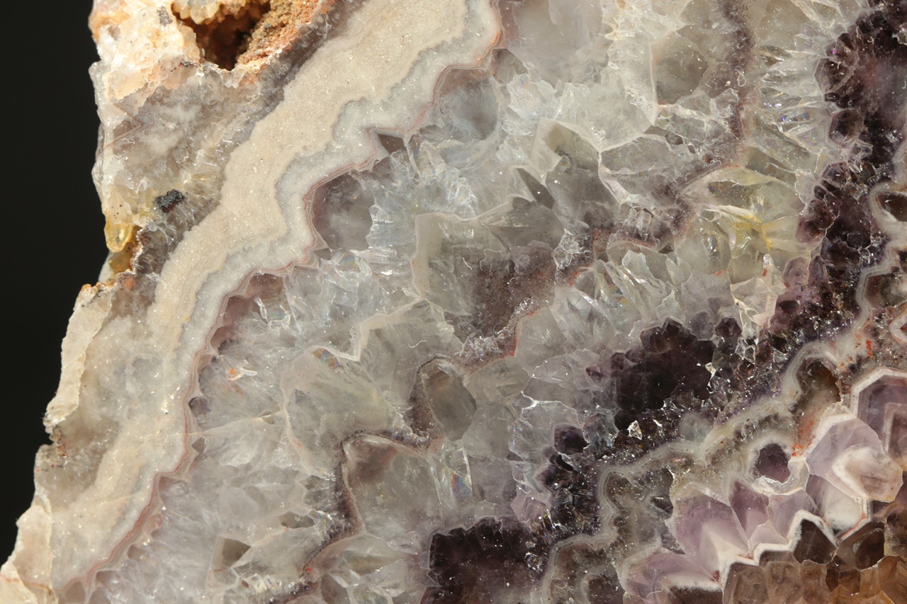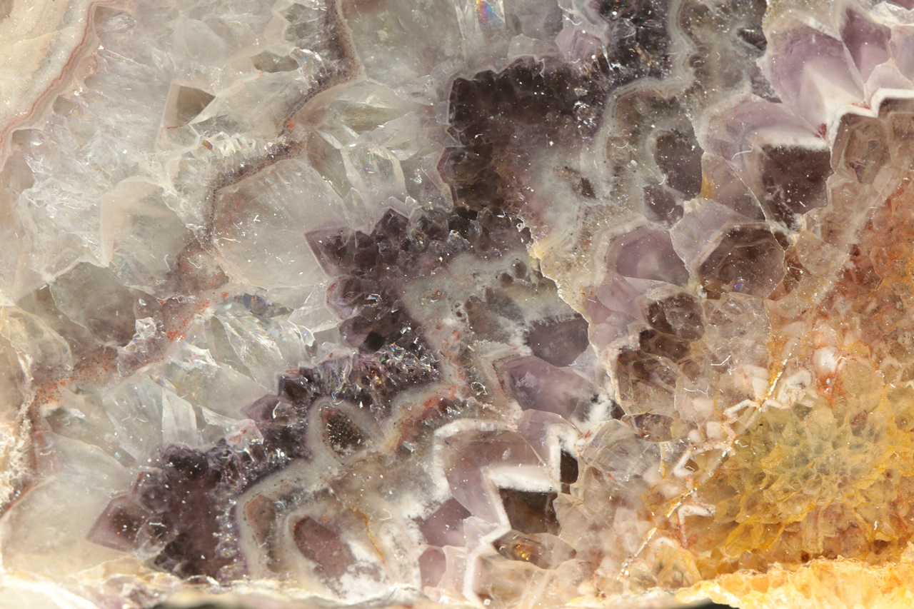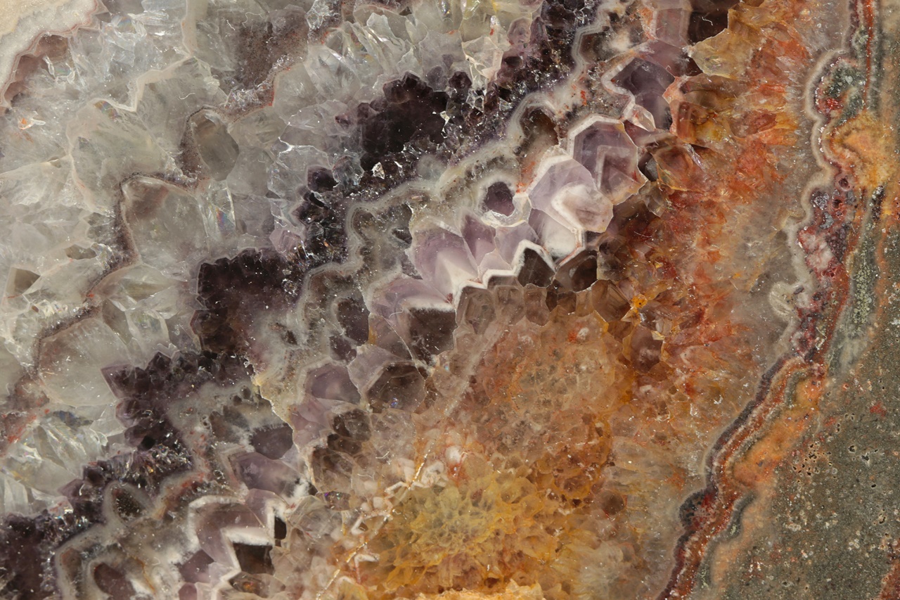 Leštěný vzorek hradbového ametystu přecházejícího do křišťálu z Krušných hor.