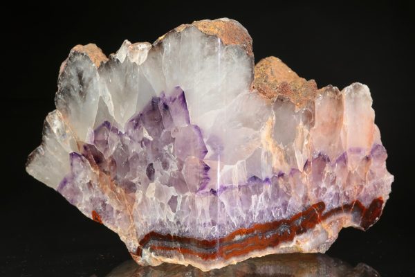 Ze dvou stran leštěný vzorek zonálního ametystu, který je svrchu do dutiny ukončený velkými krystaly.