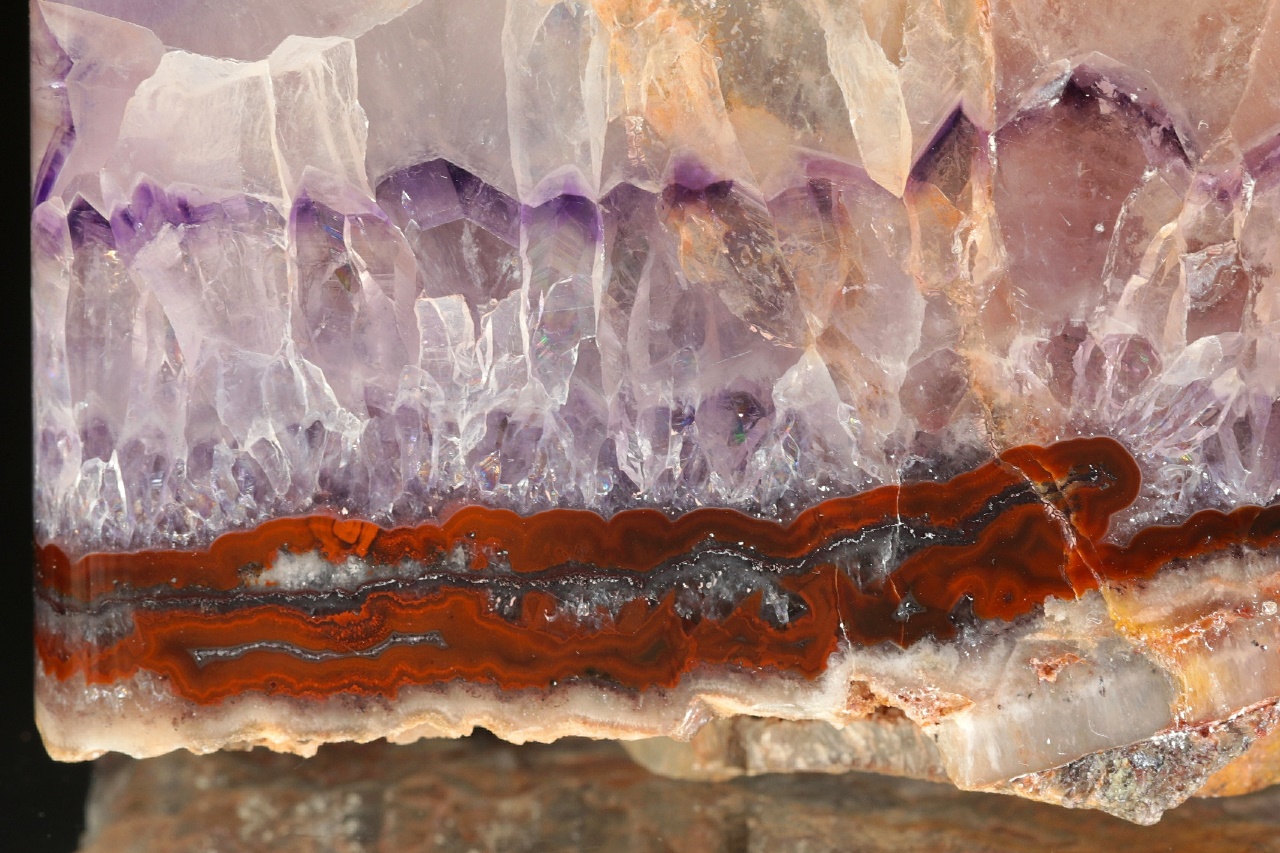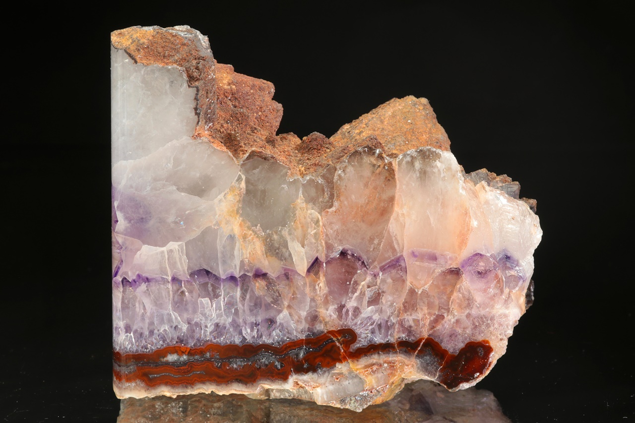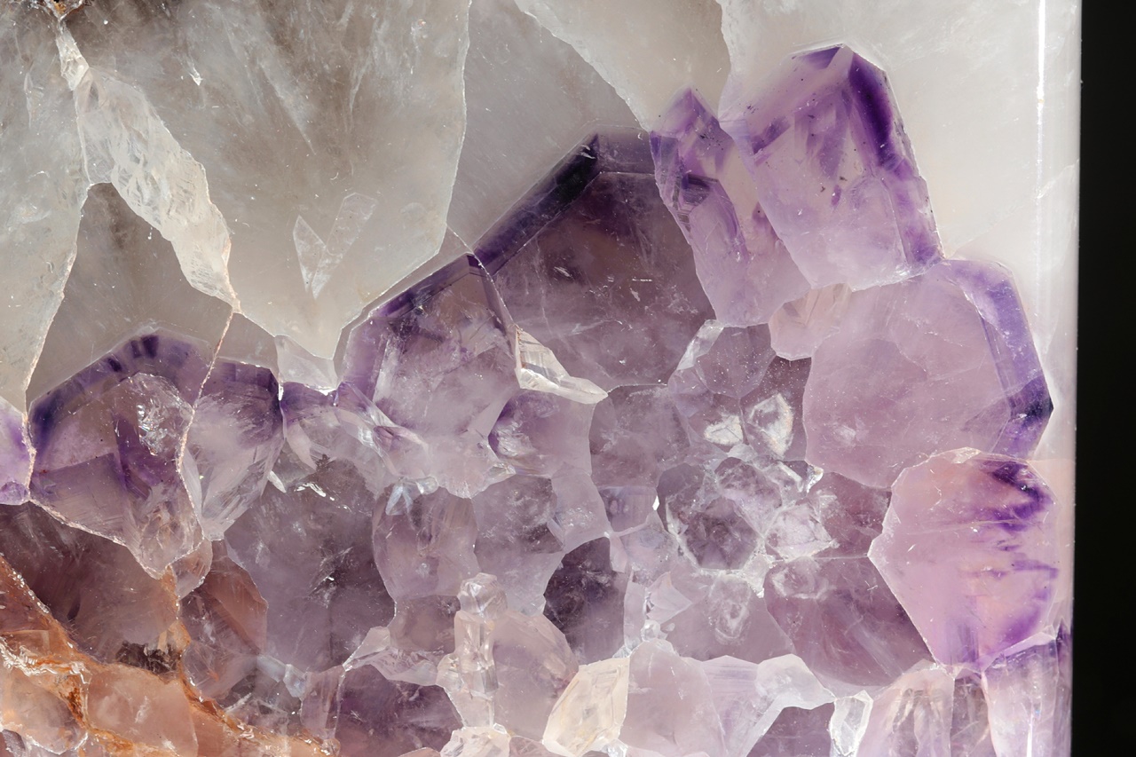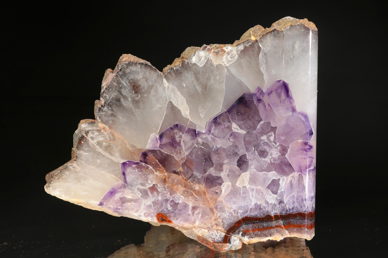 Ze dvou stran leštěný vzorek zonálního ametystu, který je svrchu do dutiny ukončený velkými krystaly.