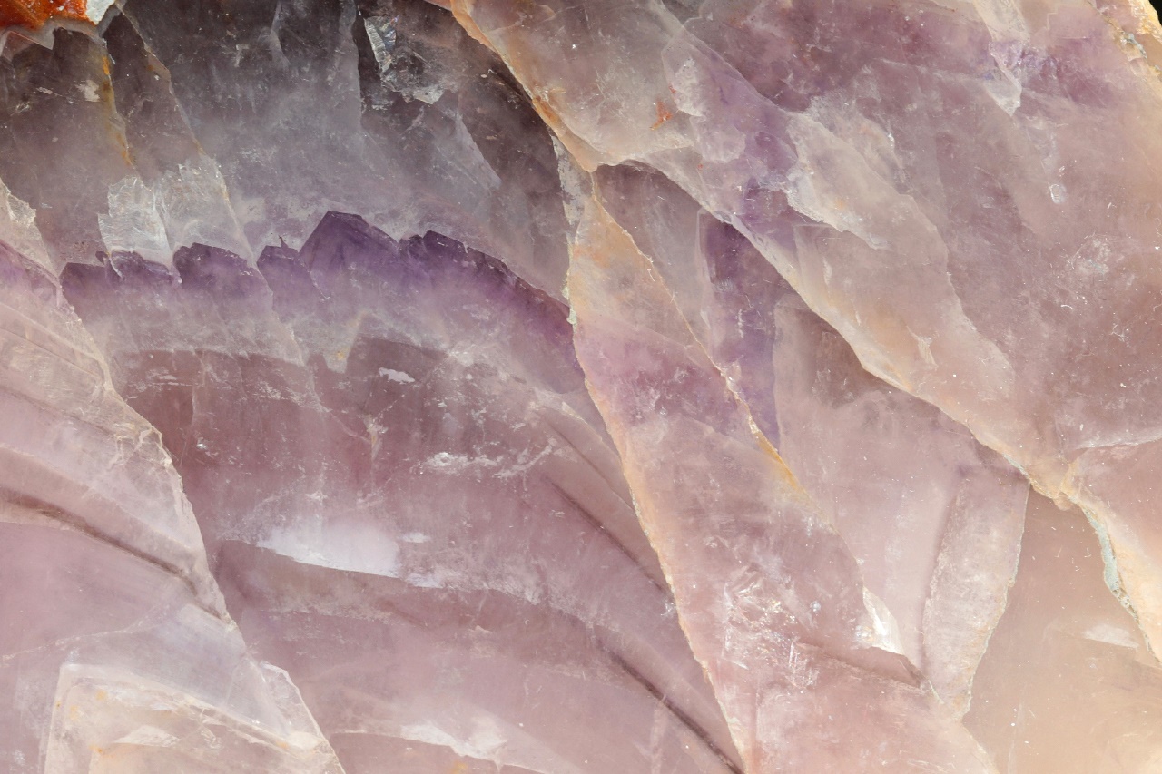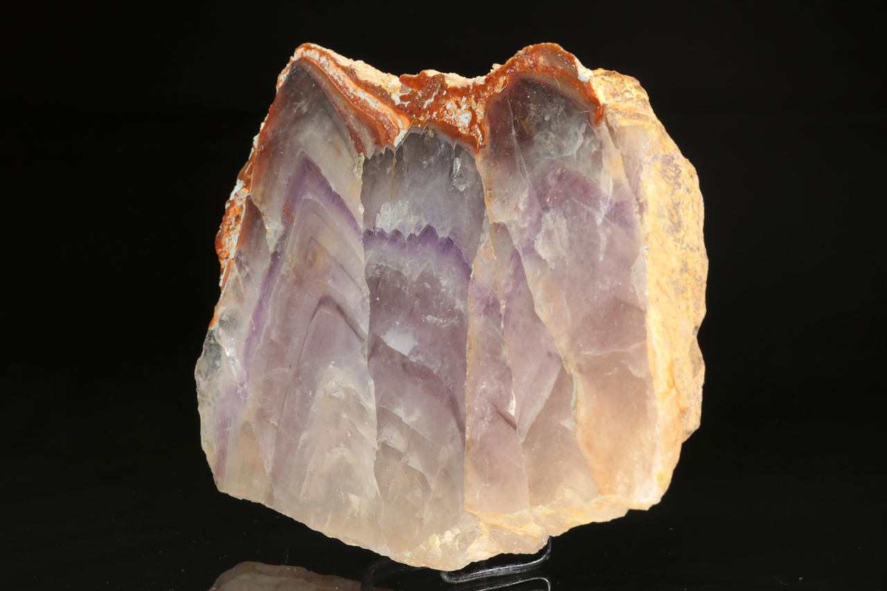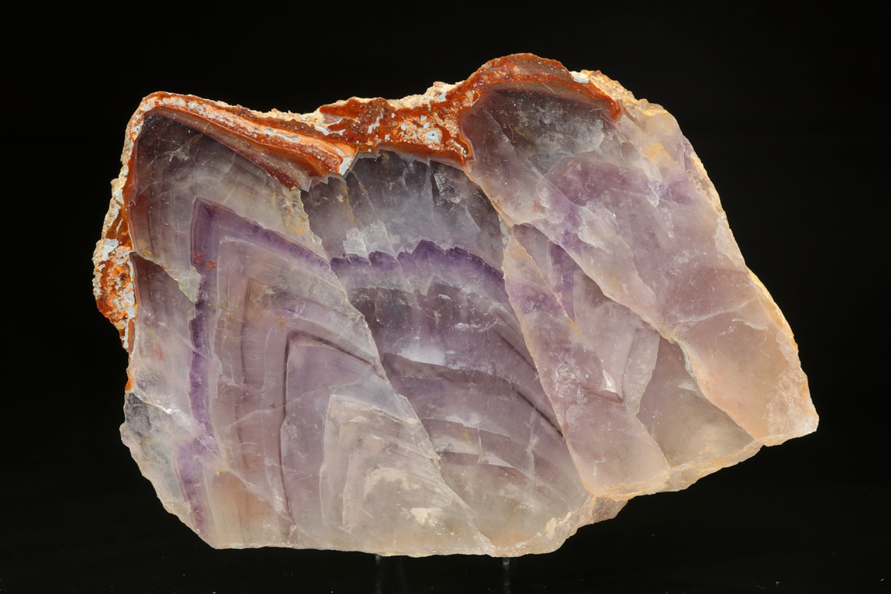 Leštěný vzorek hradbového ametystu s linkou páskovaného cihlově červeného jaspisu z vyhlášené krušnohorské lokality.
