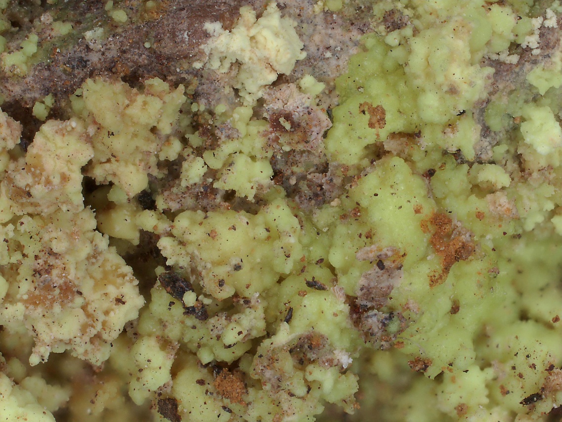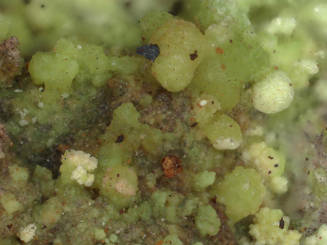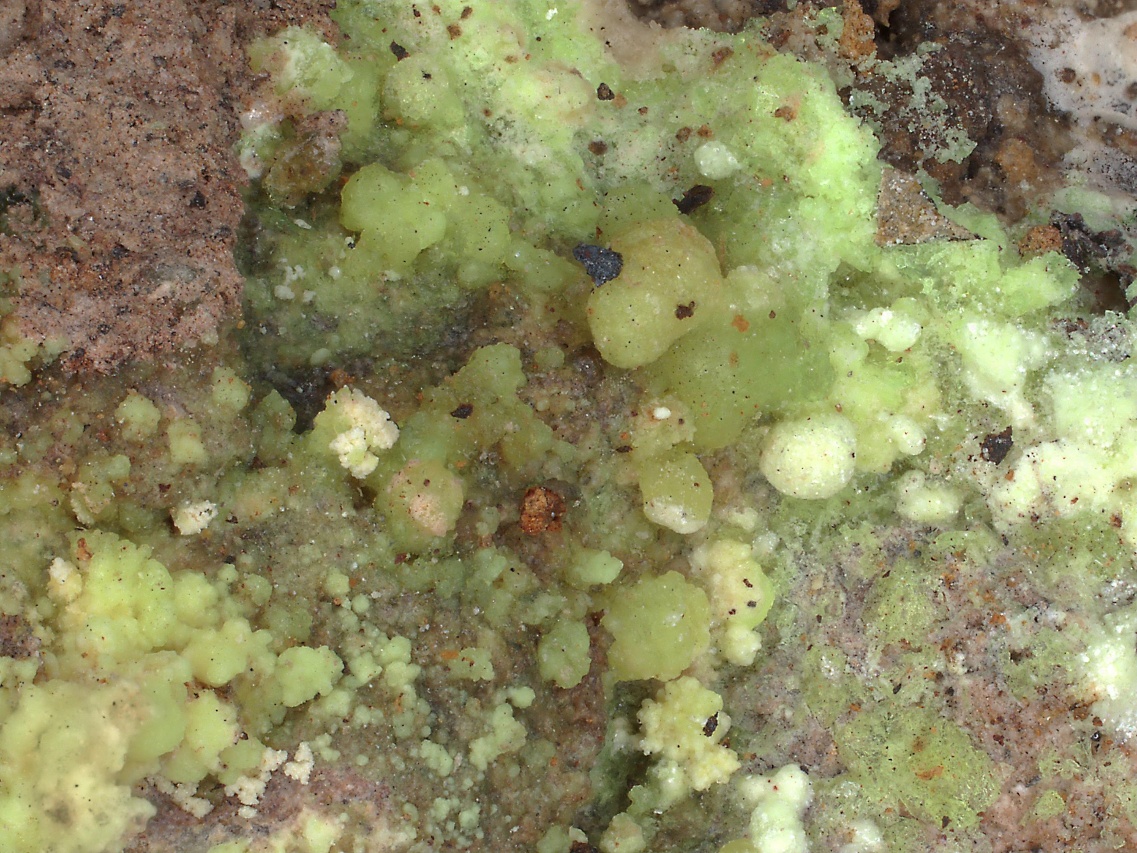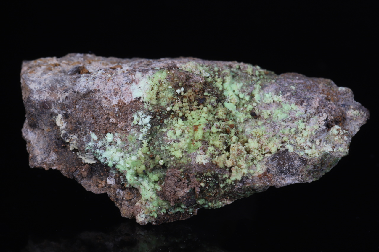 Menší, ale bohatá ukázka vzácného karbonátu uranylu – andersonitu, který tvoří světle žluté kulovité agregáty. Andersonit byl určen rtg analýzou. Na vzorku jsou pravděpodobně další minerály uranu (schröckingerit, liebigit). Ukázka pochází z uranových dolů v Jáchymově.