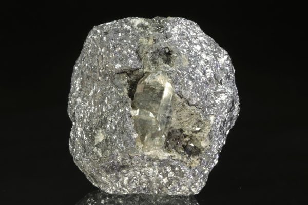 Dva centimetry dlouhý, lesklý krystal průsvitného anglesitu narostlý v dutině masivního galenitu.