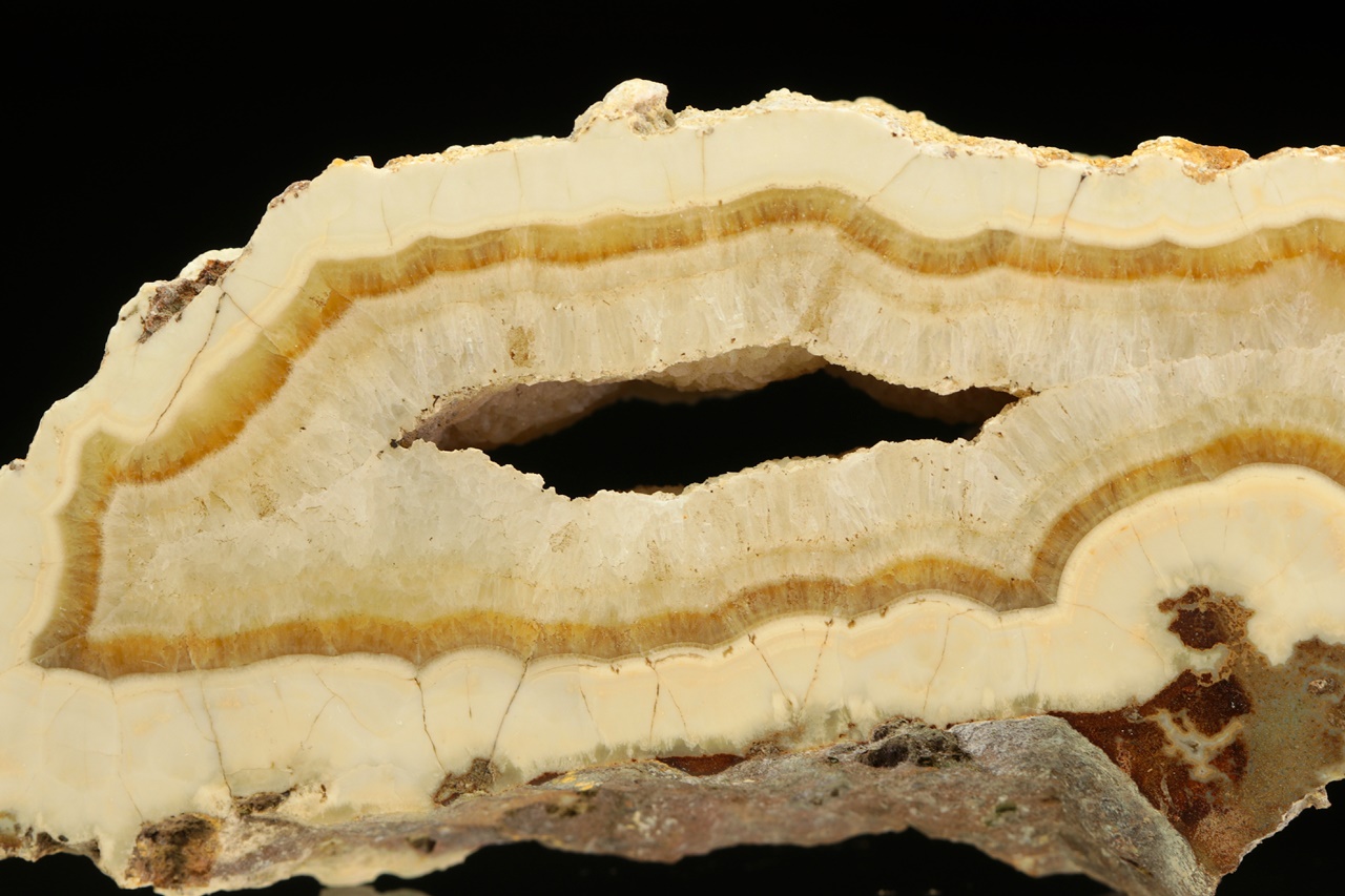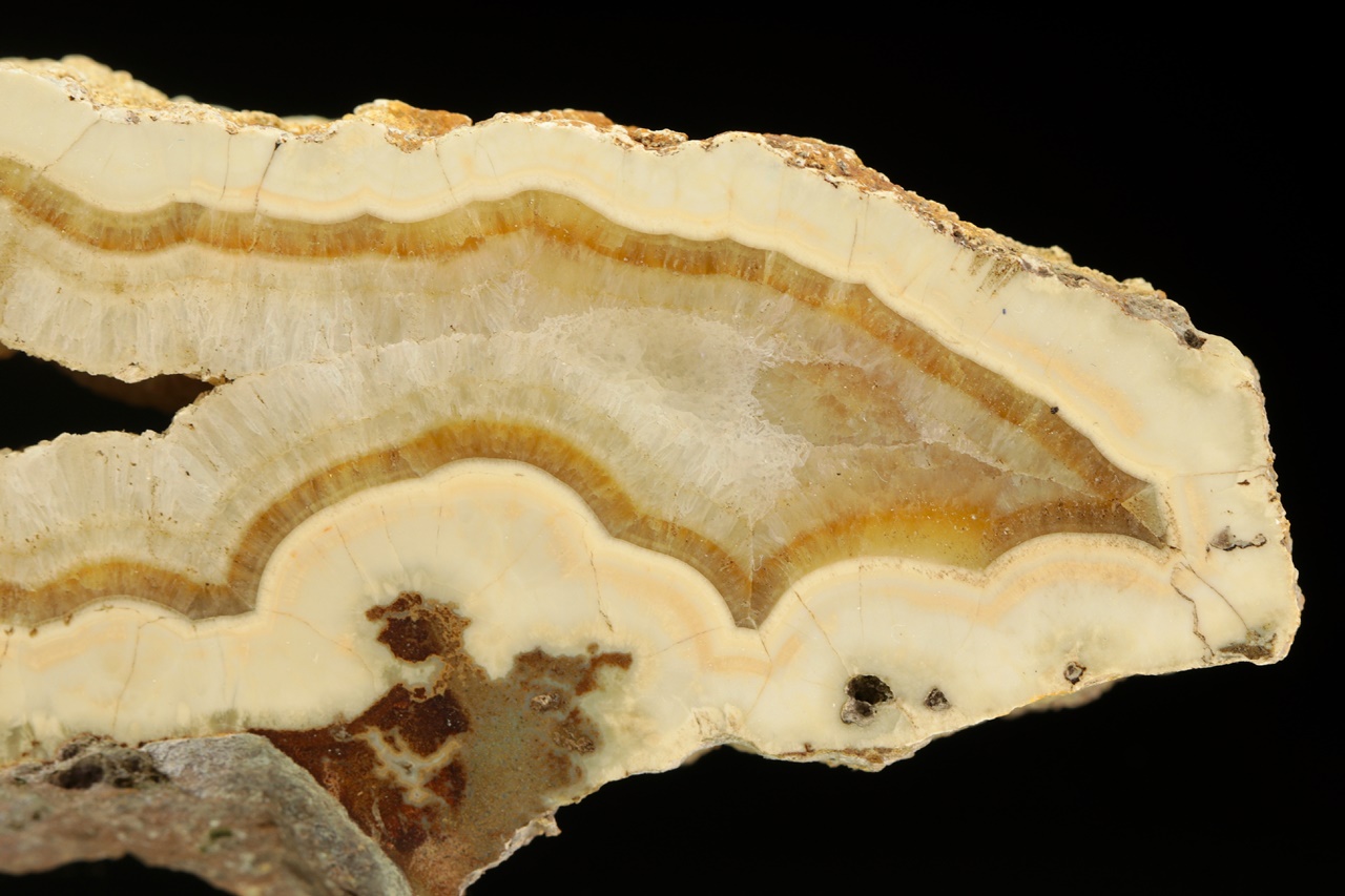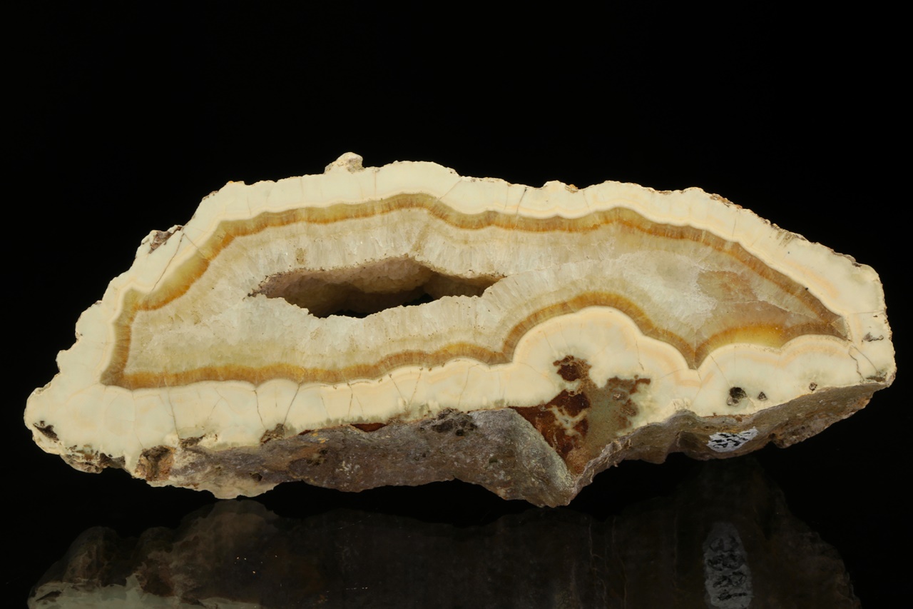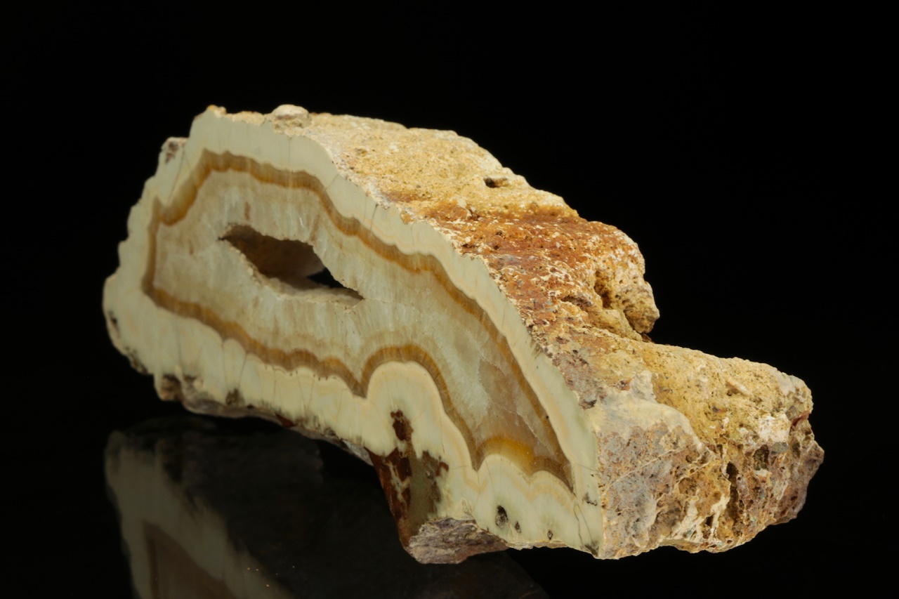 Leštěný vzorek aragonitu narůstajícího do dutiny, který svým zjevem připomíná achát.