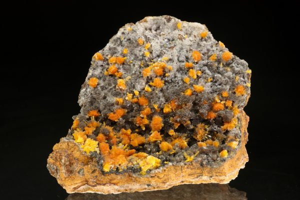 Nádherná ukázka oranžovo žlutých krystalů silikátu uranylu bohatě narůstajících na tmavý kalcit. Radiální cca 5 mm velké agregáty jsou pak přerostlé mladším bílým kalcitem.