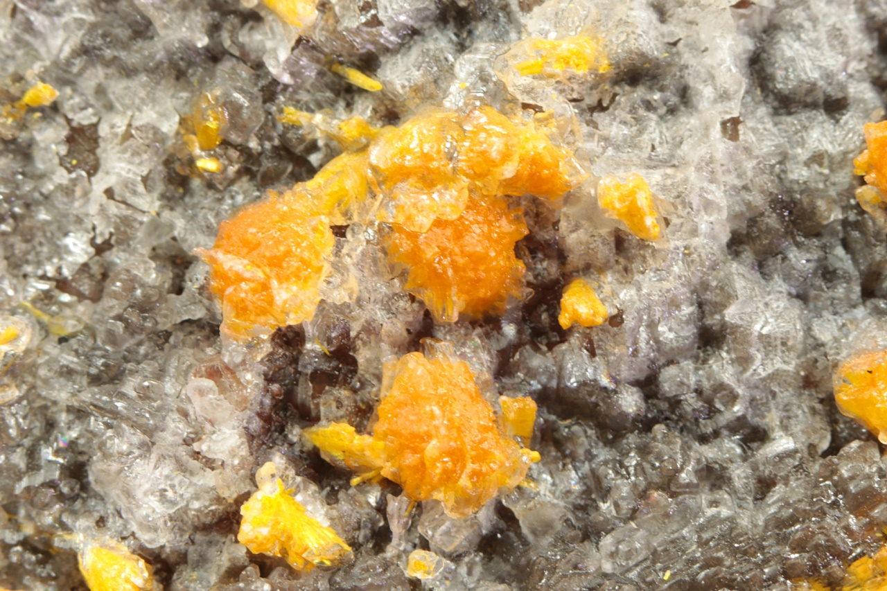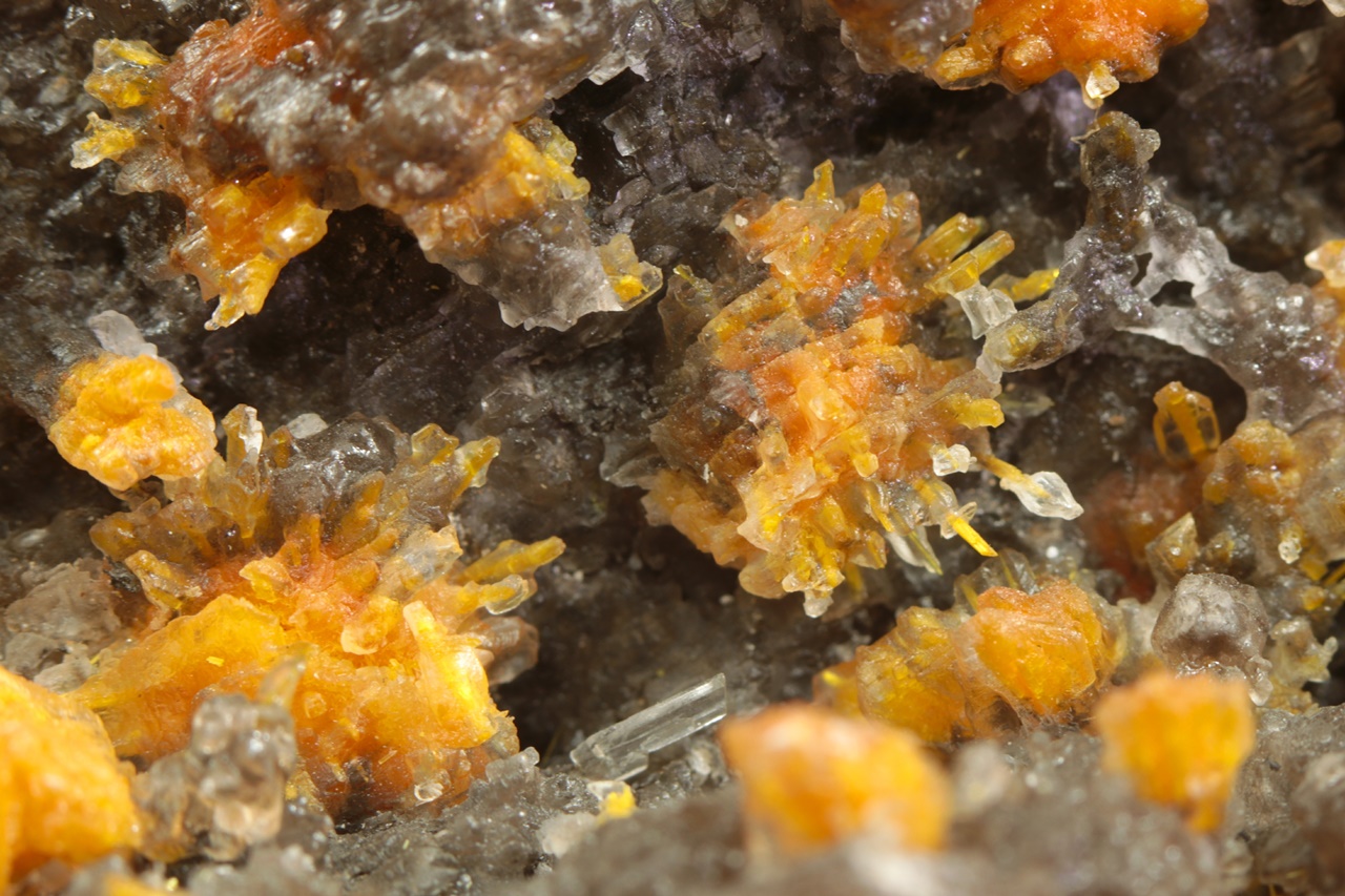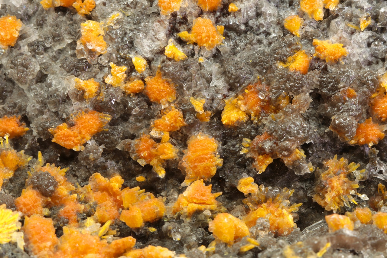 Nádherná ukázka oranžovo žlutých krystalů silikátu uranylu bohatě narůstajících na tmavý kalcit. Radiální cca 5 mm velké agregáty jsou pak přerostlé mladším bílým kalcitem.