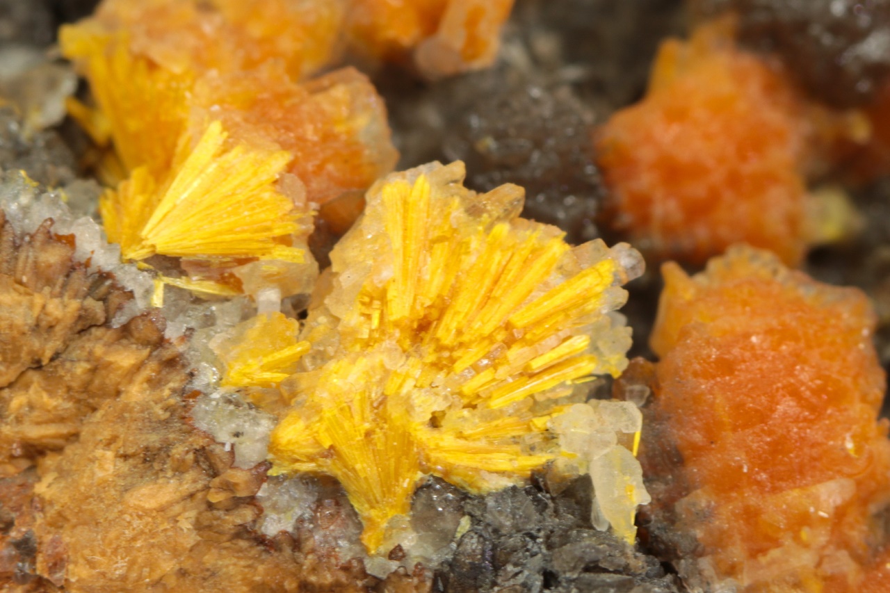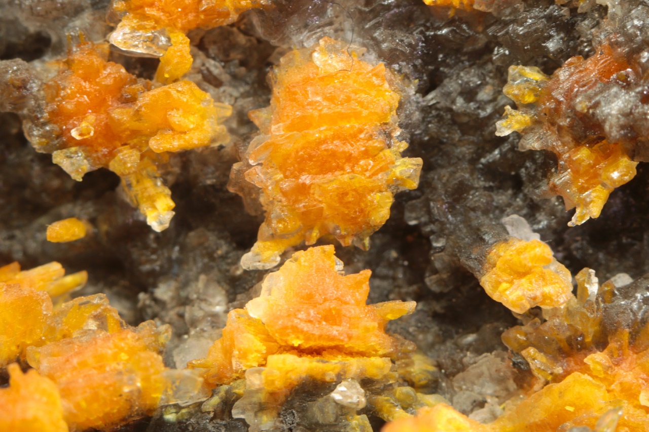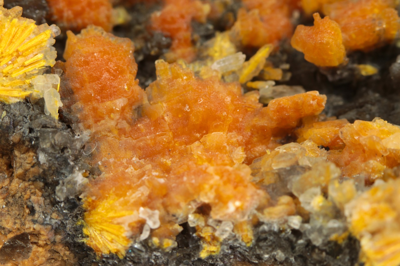 Nádherná ukázka oranžovo žlutých krystalů silikátu uranylu bohatě narůstajících na tmavý kalcit. Radiální cca 5 mm velké agregáty jsou pak přerostlé mladším bílým kalcitem.