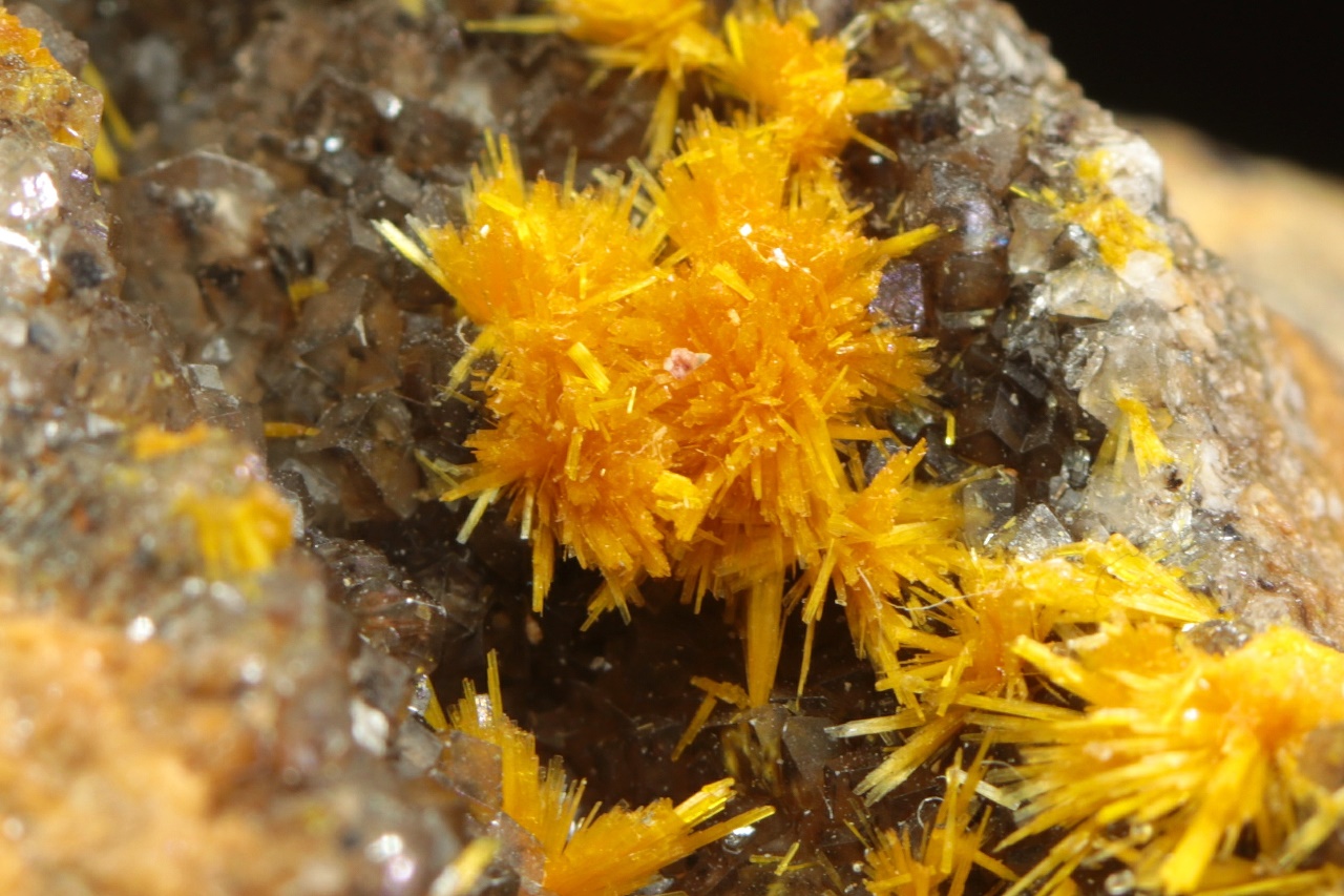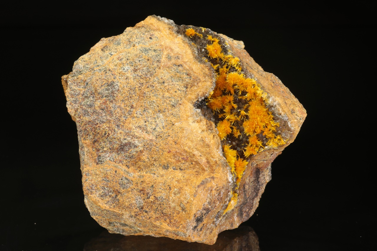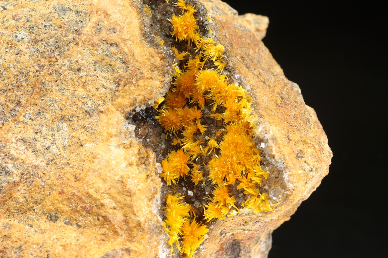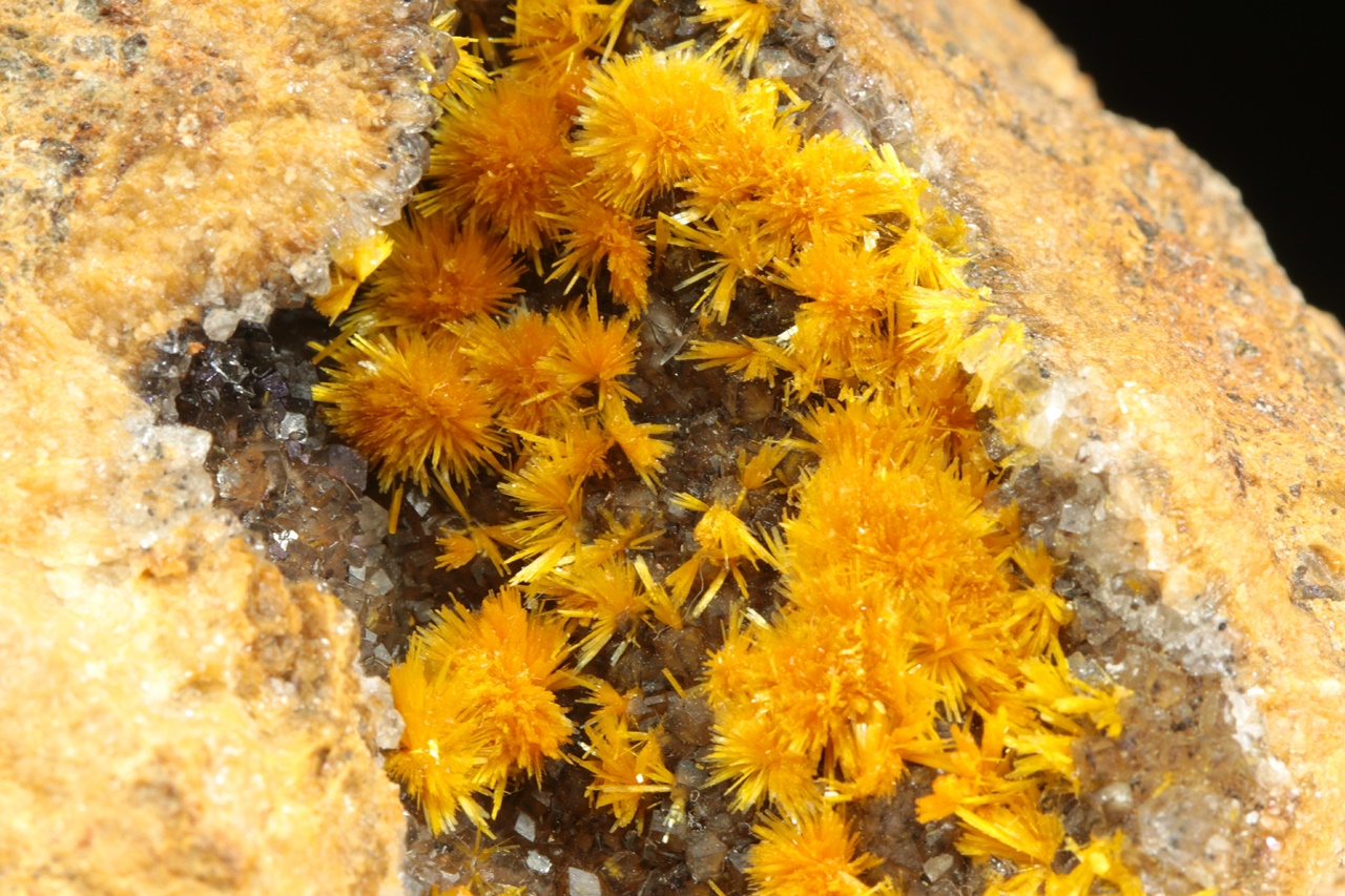 Nádherná ukázka oranžovo žlutých krystalů silikátu uranylu bohatě narůstajících na tmavý kalcit. Sloupcovité, až tři milimetry velké krystaly tvoří radiální agregáty připomínající květy. Rozměry dutiny jsou 6 × 3 cm.