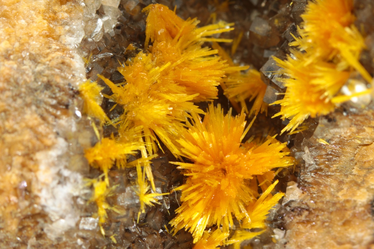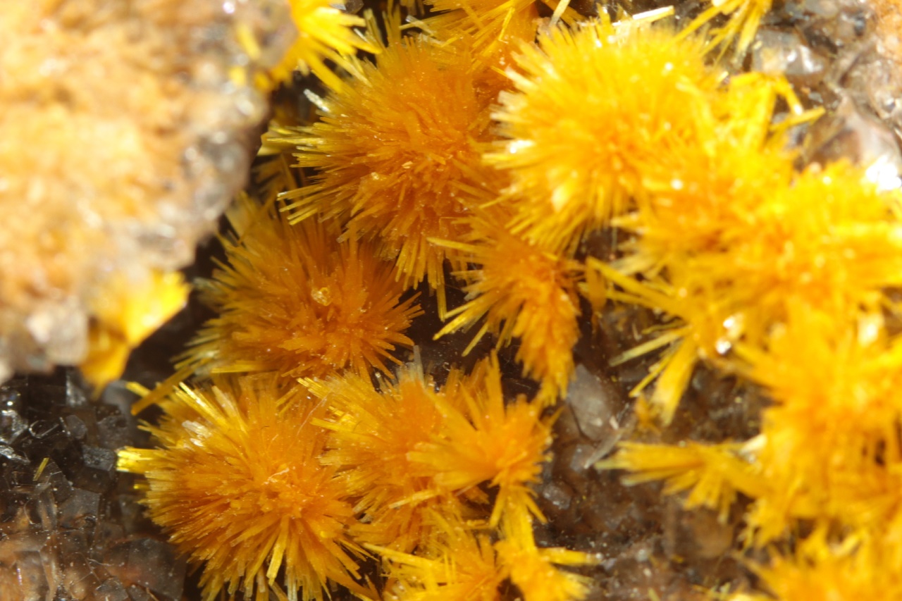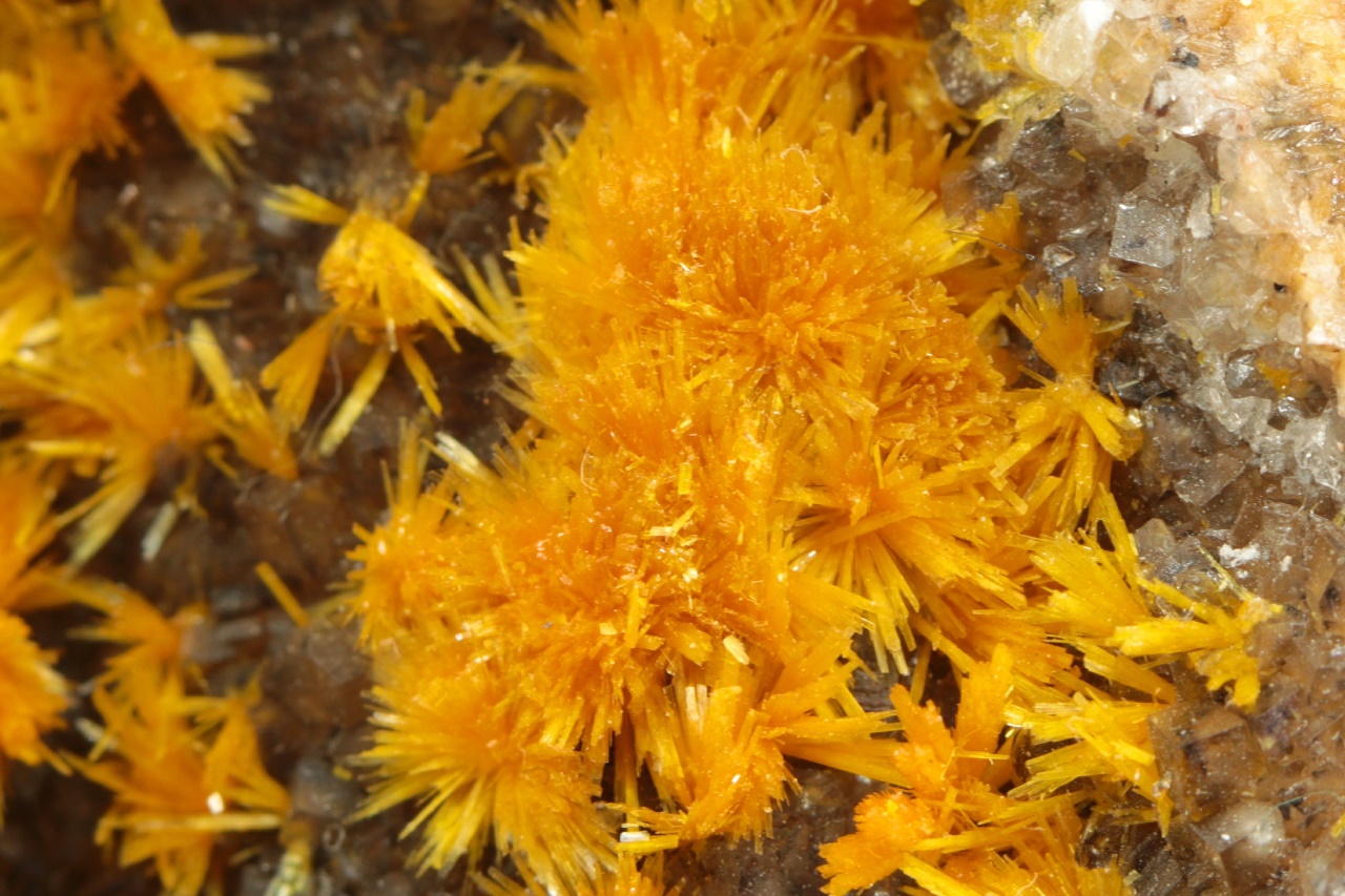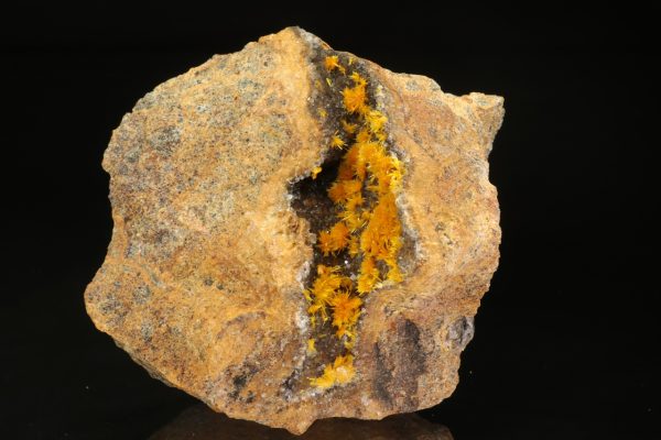 Nádherná ukázka oranžovo žlutých krystalů silikátu uranylu bohatě narůstajících na tmavý kalcit. Sloupcovité, až tři milimetry velké krystaly tvoří radiální agregáty připomínající květy. Rozměry dutiny jsou 6 × 3 cm.