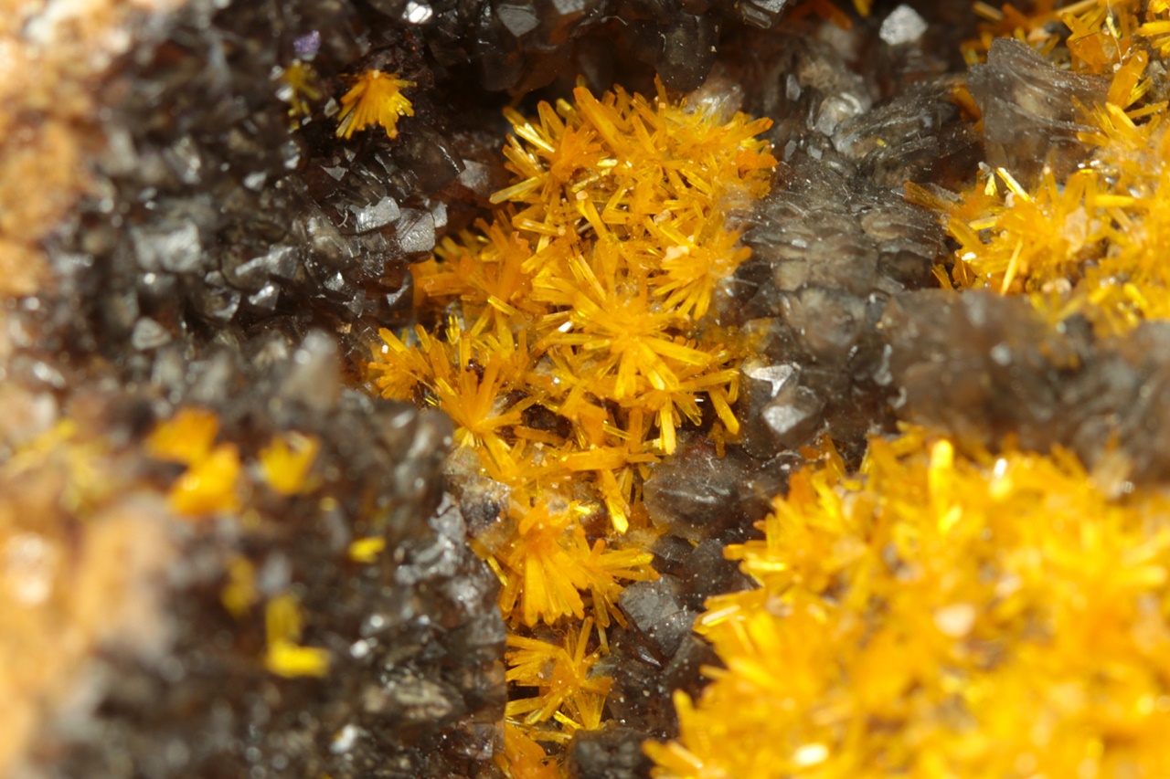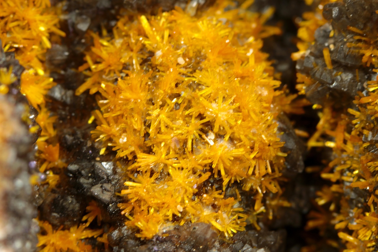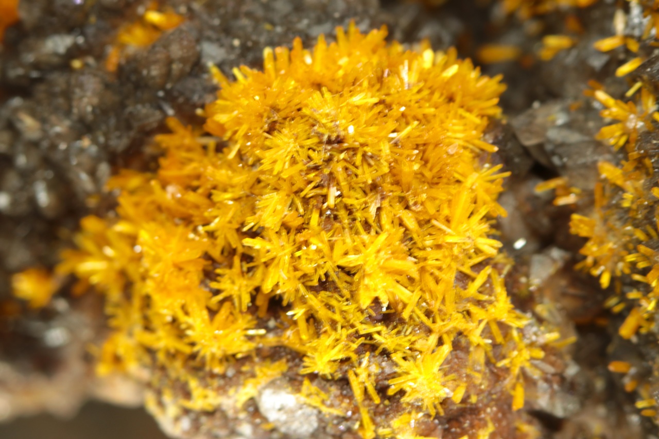 Nádherná ukázka sytě žlutých krystalů silikátu uranylu bohatě narůstajících na tmavý kalcit. Sloupcovité, až dva milimatry velké krystaly tvoří radiální agregáty připomínající květy.