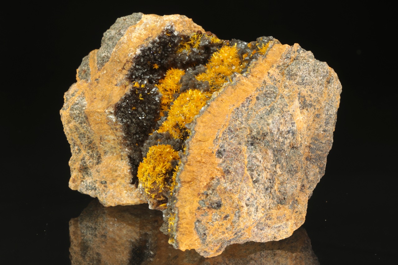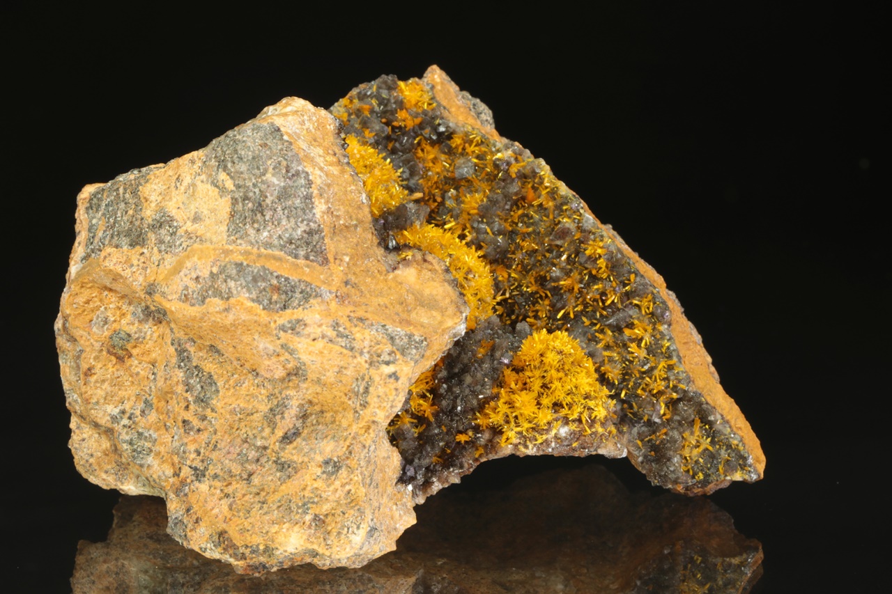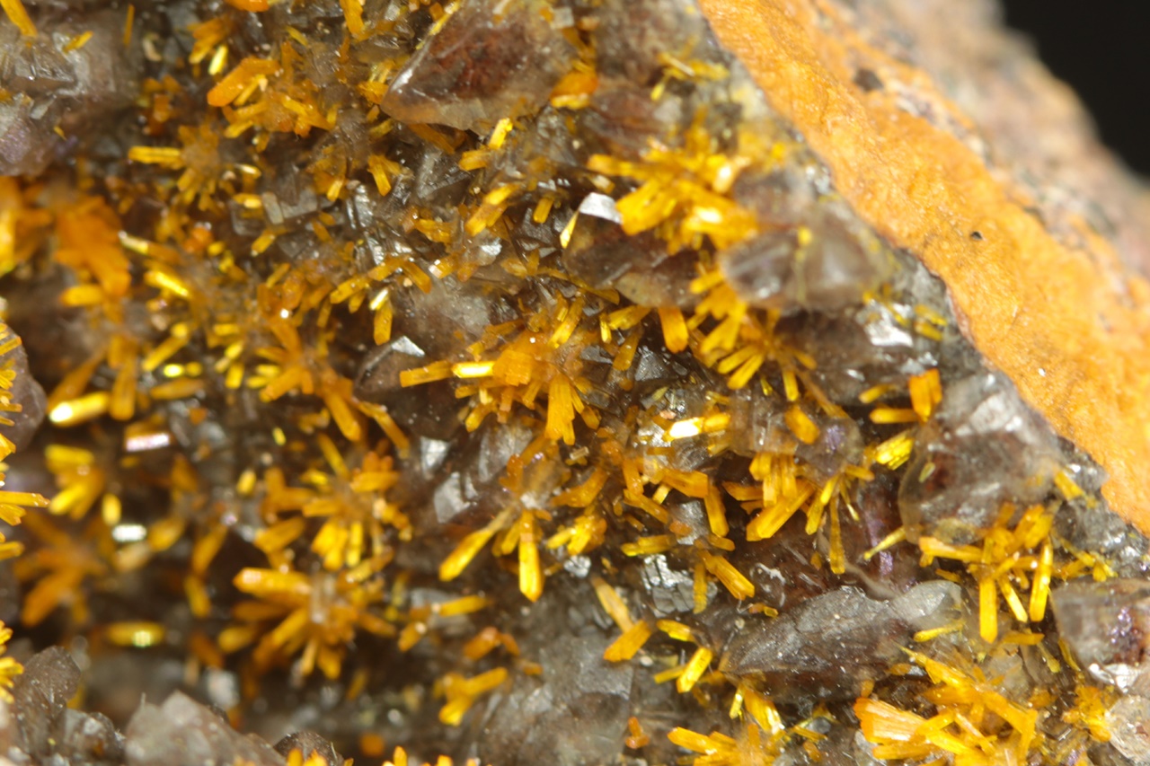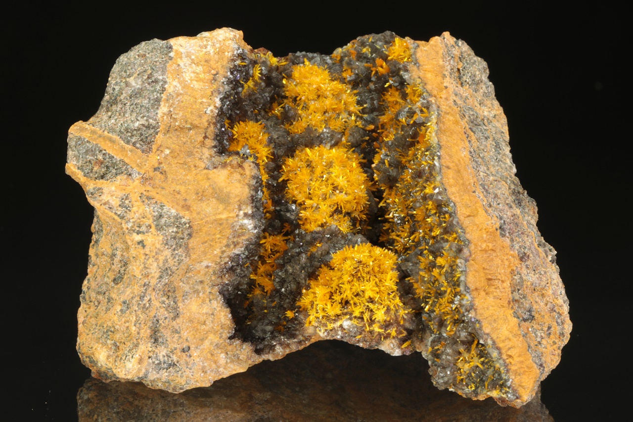 Nádherná ukázka sytě žlutých krystalů silikátu uranylu bohatě narůstajících na tmavý kalcit. Sloupcovité, až dva milimatry velké krystaly tvoří radiální agregáty připomínající květy.