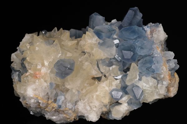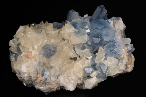 Velmi estetický kontrastní vzorek až 2 cm velkých krystalů celestýnu spolu se skalenoedry kalcitu. Sbírková ukázka celestýnu z relativně nových nálezů z Afghánistánu.