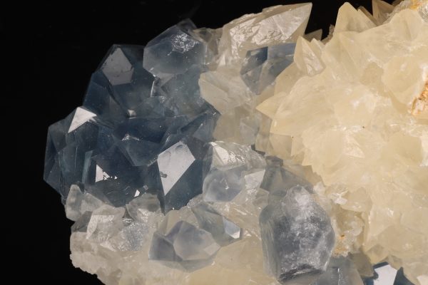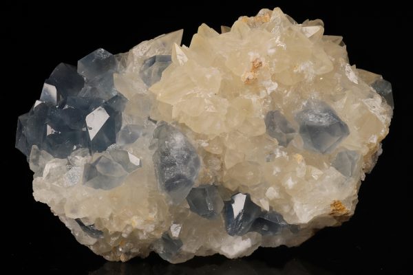 Kontrastní estetický vzorek sytě modrých krystalů celestýnu spolu se skalenoedry kalcitu. Velmi pěkná ukázka celestýnu z relativně nových nálezů z Afghánistánu.