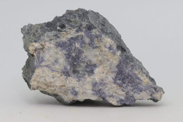 Krásná ukázka fialového paprsčitého dumortieritu z Psár u Jílového. Jednotlivé jehlicovité krystaly dosahují délek až 1 cm. Kámen je zezadu na ploše cca. 4 x 5 cm řízlý.