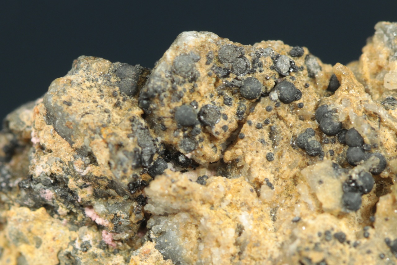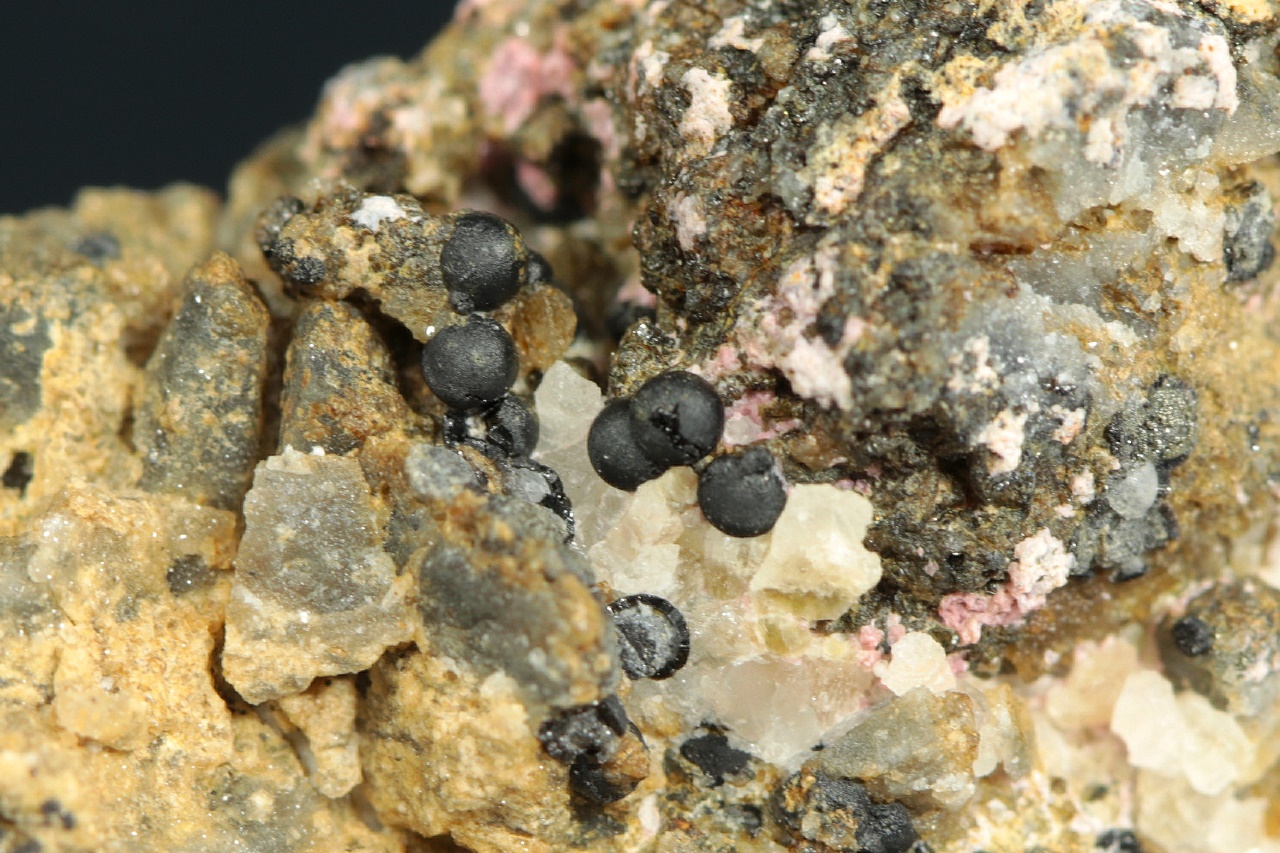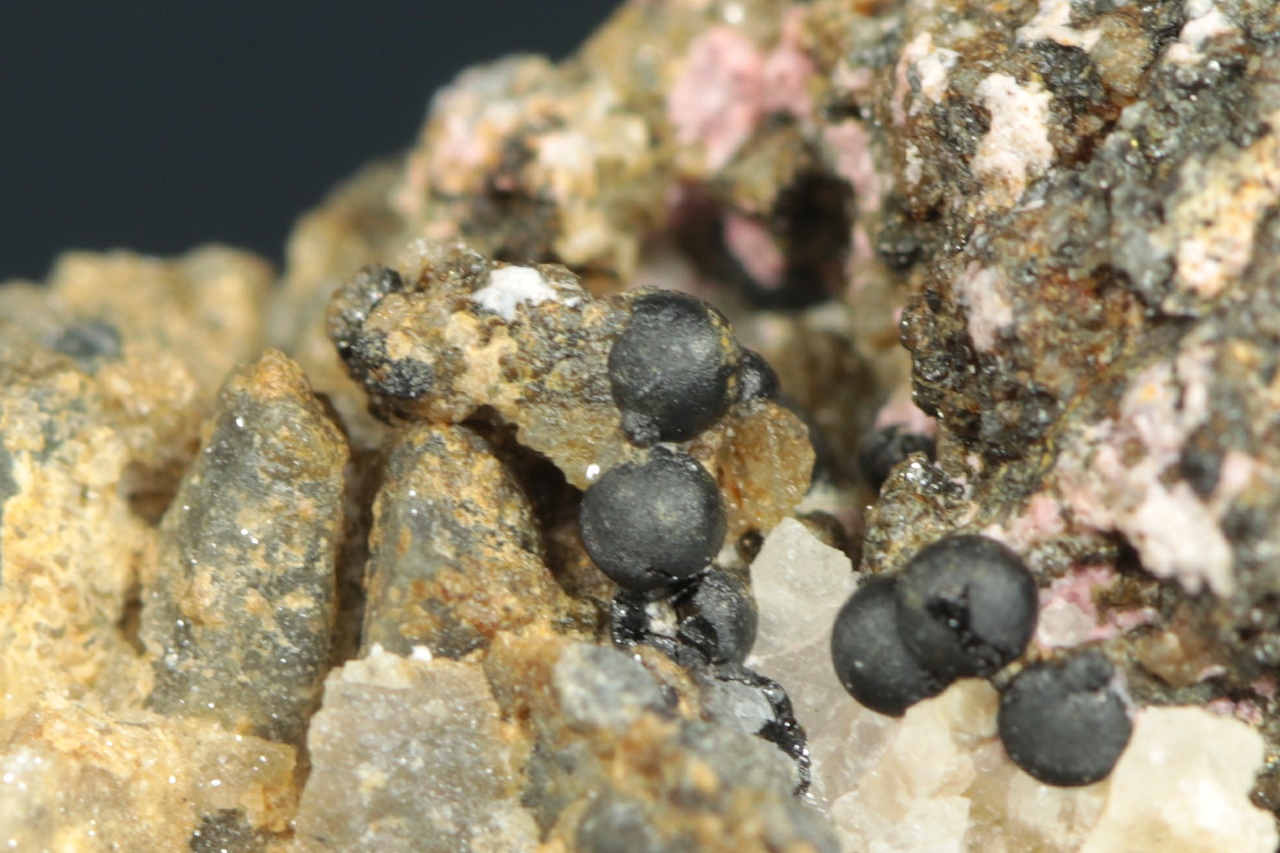 Silikát bismutut – eulytin tvořící černé kulovité agregátu cca 1 mm velké. Vzorek pochází z haldy štoly Adam.