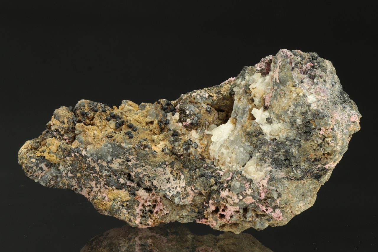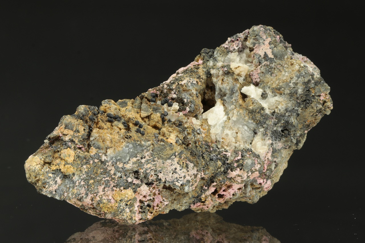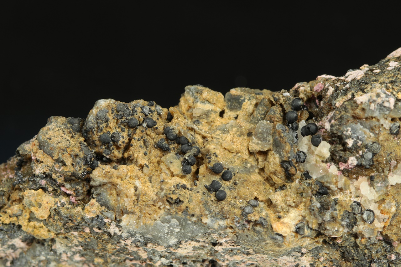 Silikát bismutut – eulytin tvořící černé kulovité agregátu cca 1 mm velké. Vzorek pochází z haldy štoly Adam.