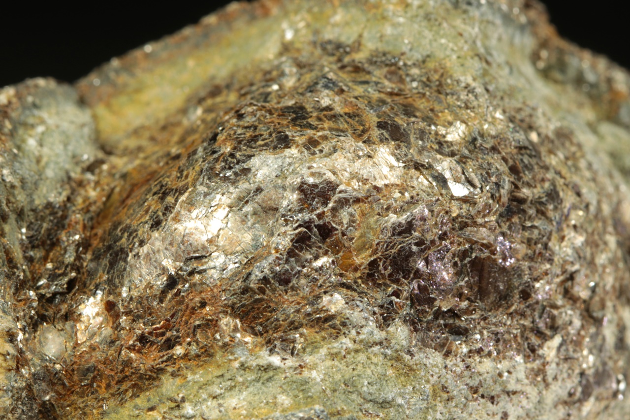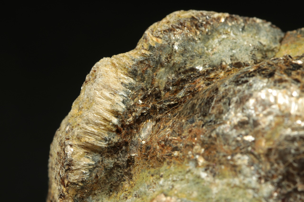 Ukázka tzv. heřmanovské koule. Jádro koule tvoří tmavý lesklý flogopit, který je po celém obvodu lemovaný paprsčitě uspořádanými jehlicemi stříbrně šedého antofylitu. Vnější okraj koule opět pokrývá tenká vrstvička šupin flogopitu. Jedná se o velmi raritní mineralogickou zajímavost.