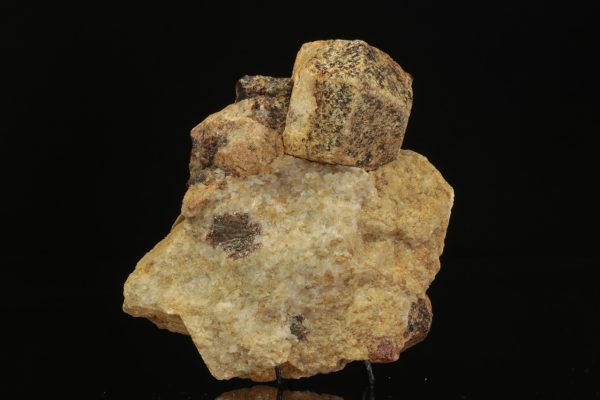 Rombododekaedrické krystaly béžovo hnědého, vápníkem bohatého granátu ve vápenci. Největší krystal je 4 cm velký.