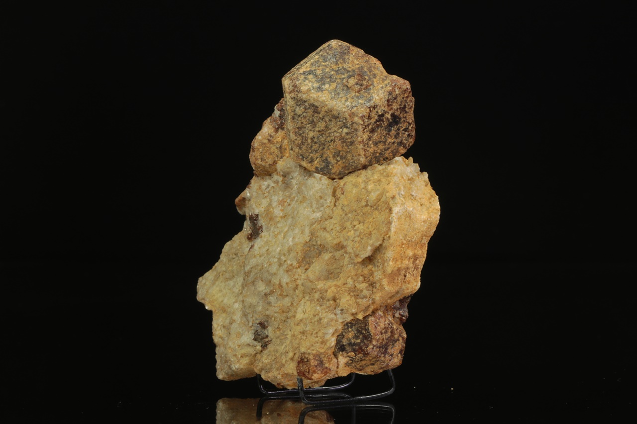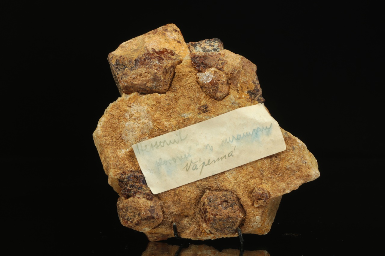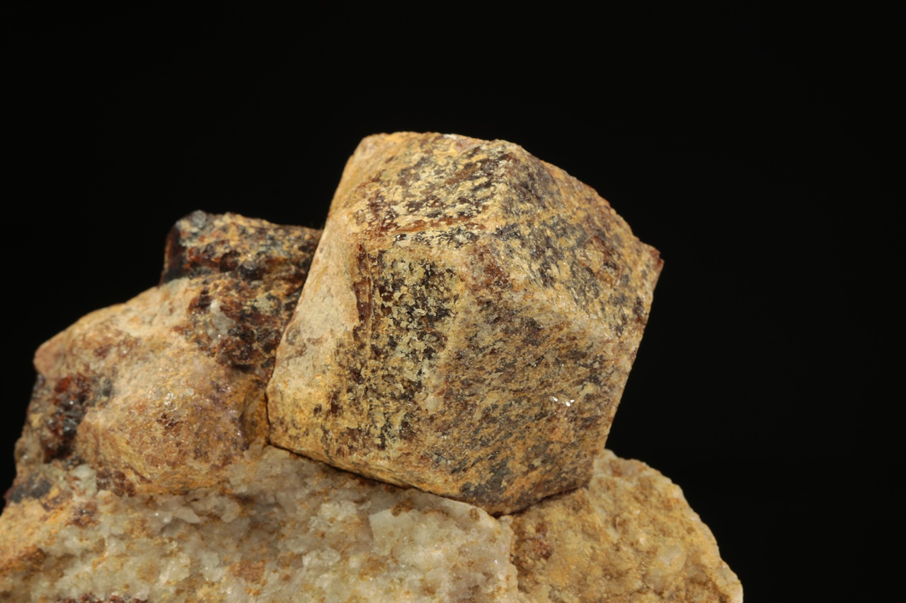 Rombododekaedrické krystaly béžovo hnědého, vápníkem bohatého granátu ve vápenci. Největší krystal je 4 cm velký.