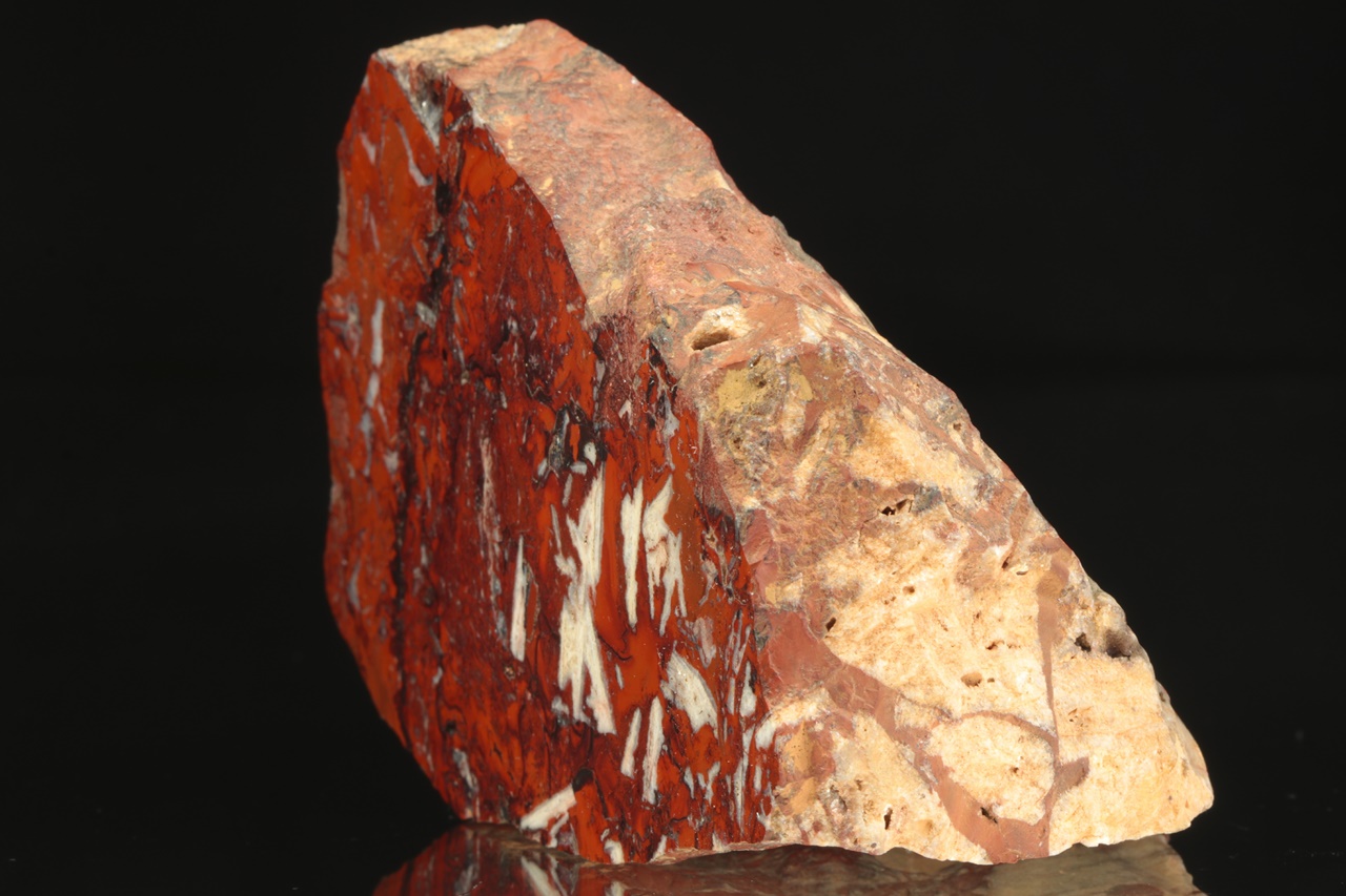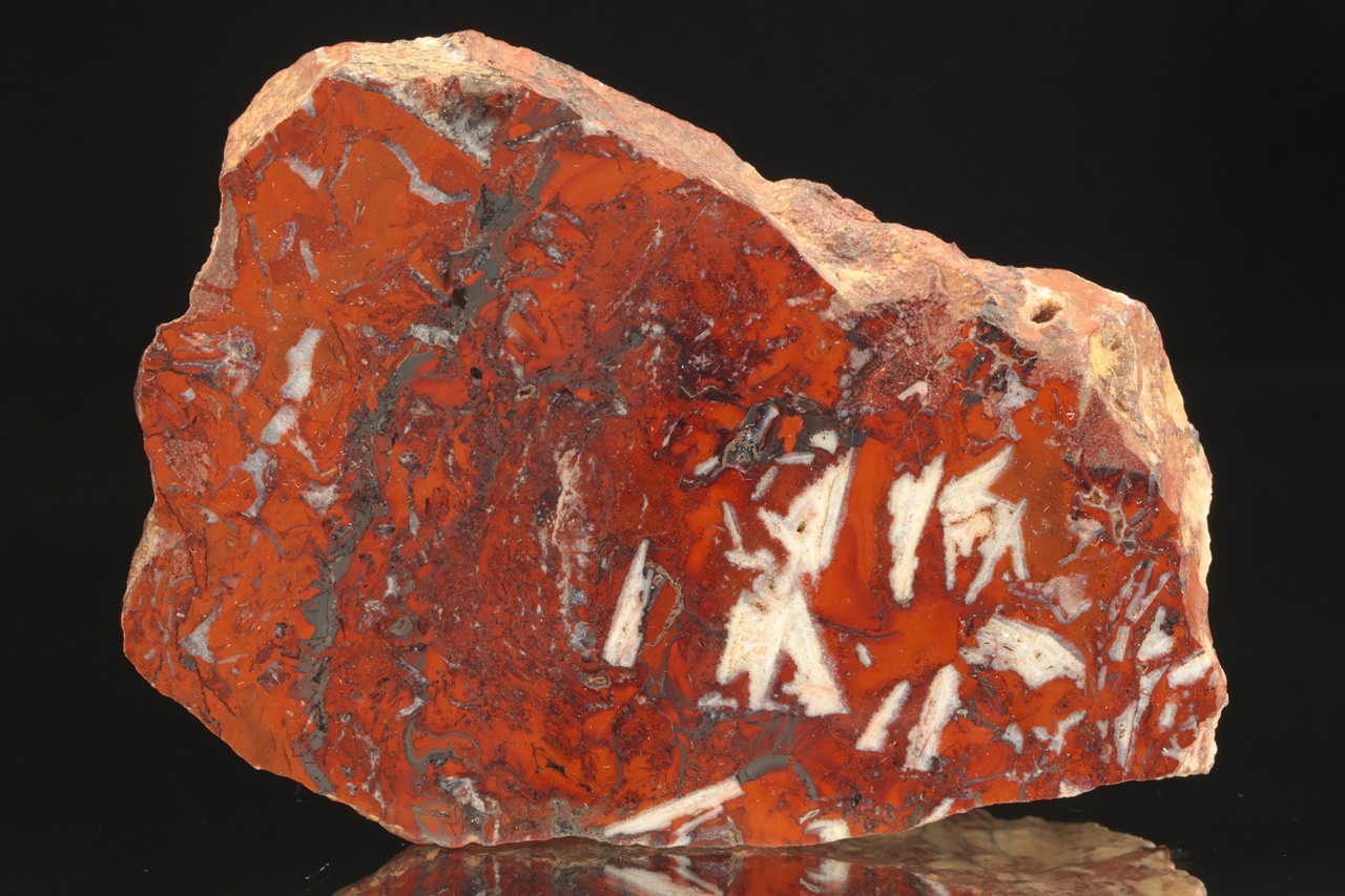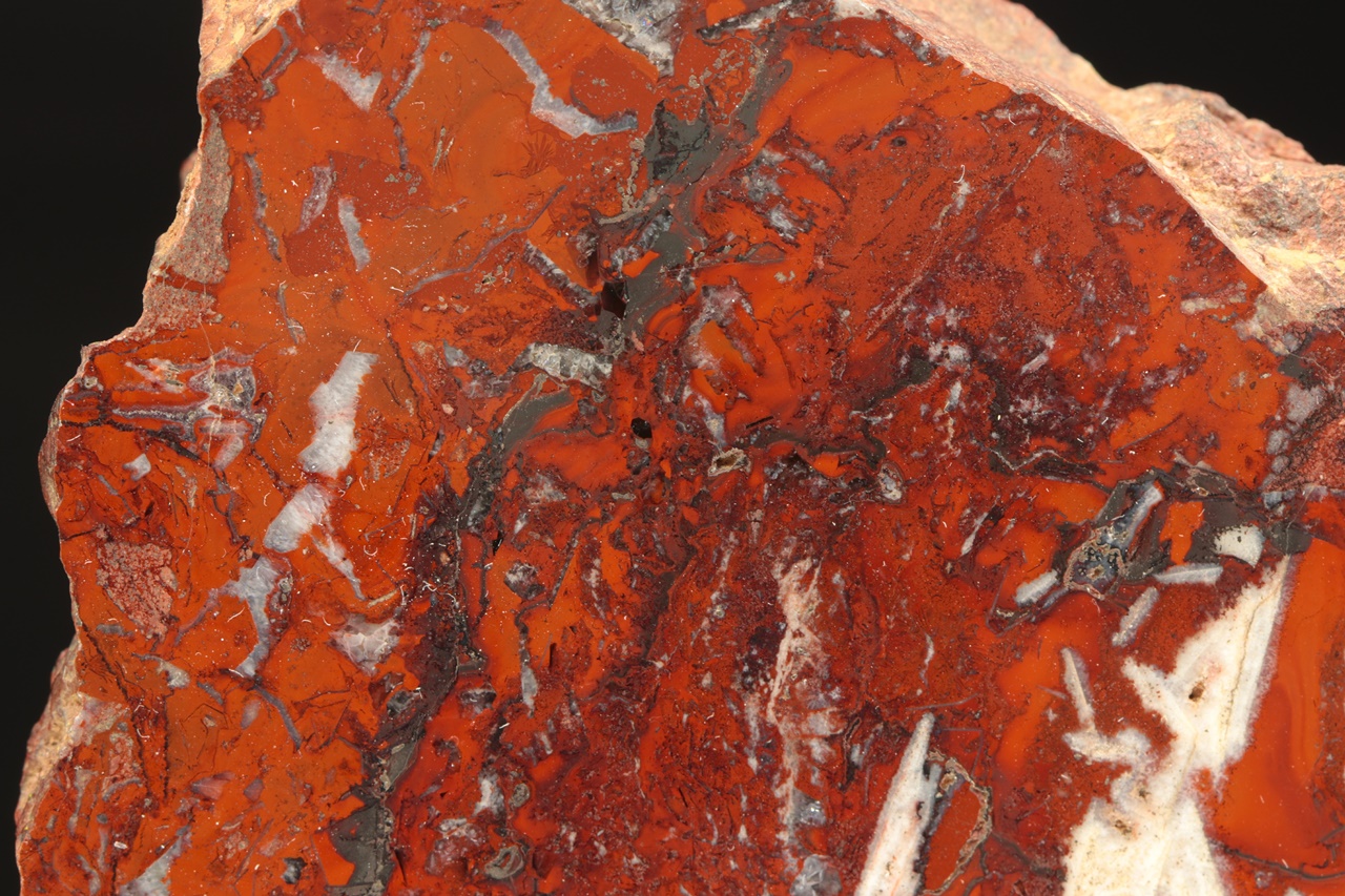 Leštěný vzorek nádherně červeného jaspisu s hematitovými žilkami.