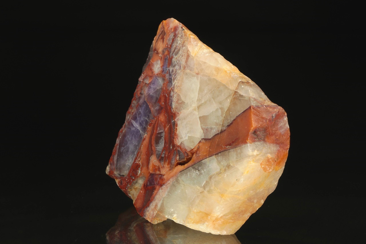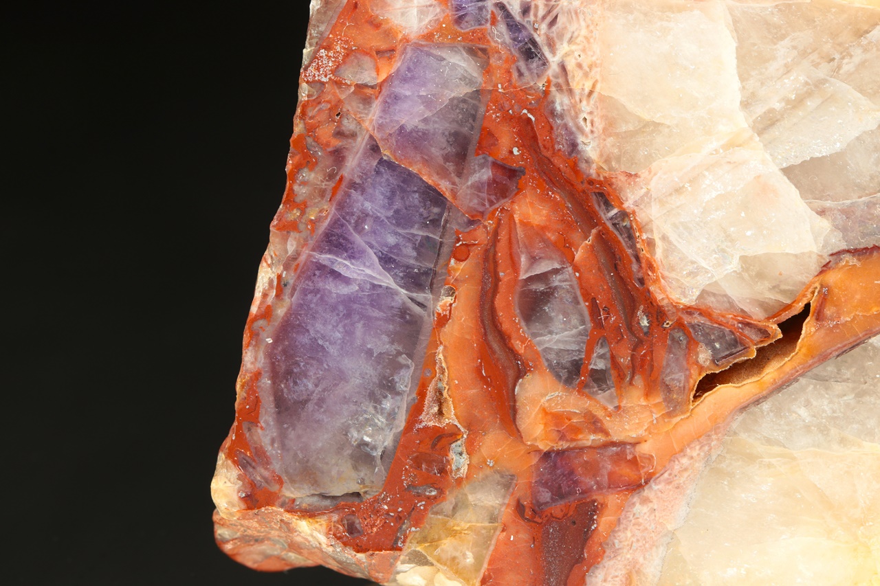 Brekcie tvořená bílým křemenem a ametystem stmelená cihlově červeným jaspisem z vyhlášené krušnohorské lokality.