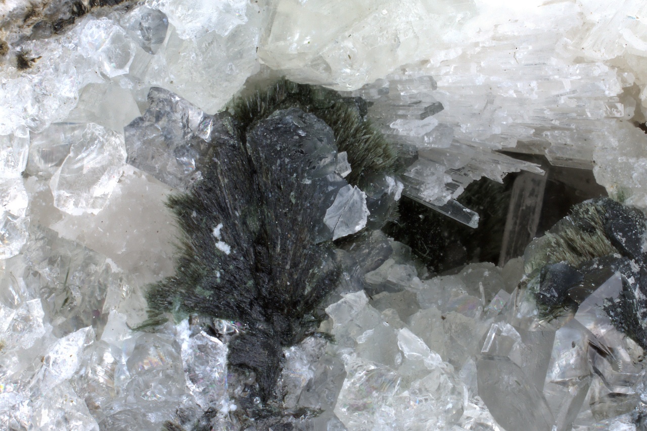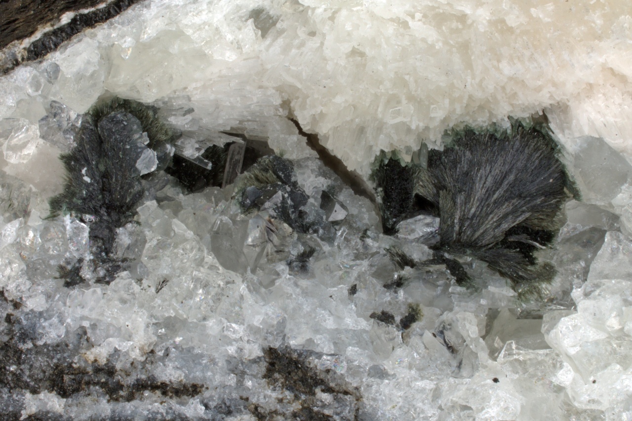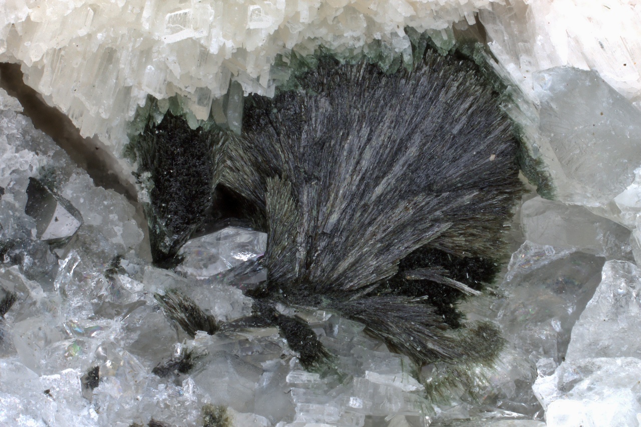 Kvalitní ukázka v České republice nově popsaného vzácného minerálu z pumpellyitové řady julgolditu-Fe2+ ,ktarý tvoří vějířovité agregáty do velikosti 4 mm složené z vláknitých tmavě zelených krystalů. Tyto agregáty narůstají do dutiny spolu s pektolitem a z lokality nově popsaným datolitem. Na tento minerální druh velmi pěkná ukázka, pocházející z kamenolomu v Košťálově.