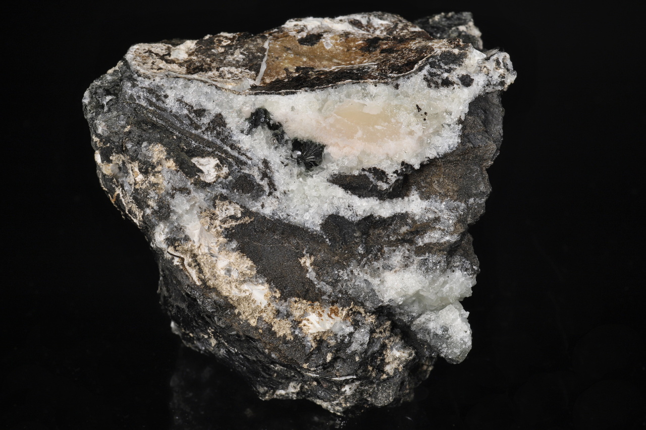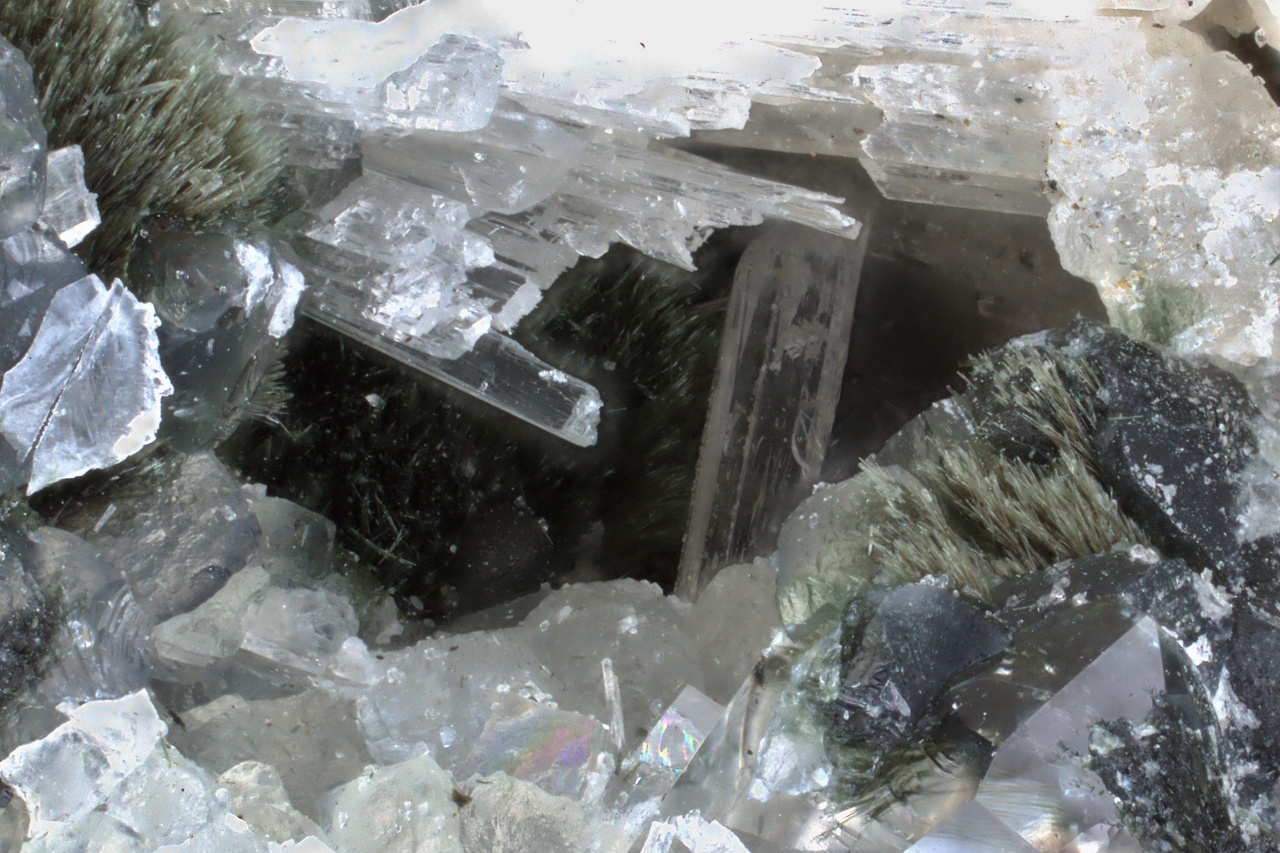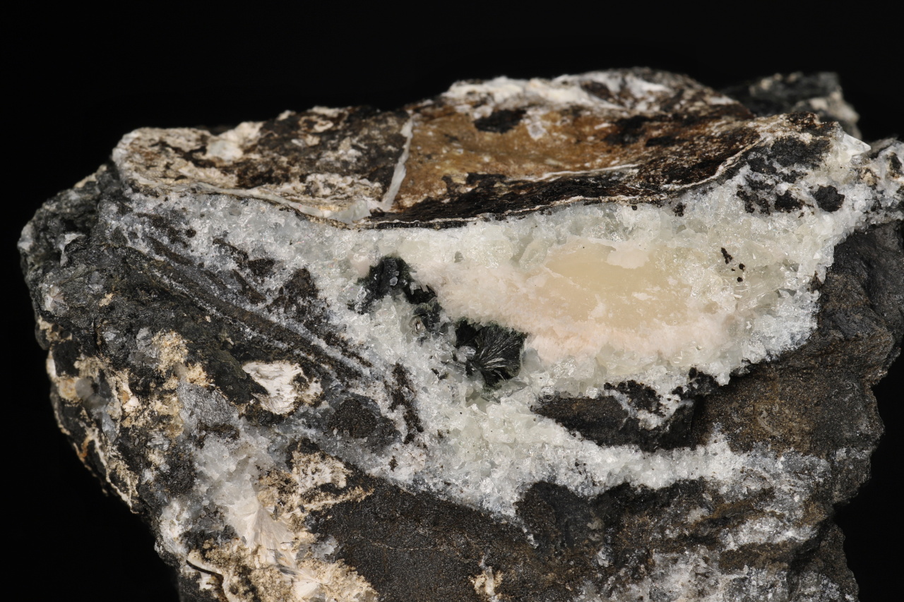 Kvalitní ukázka v České republice nově popsaného vzácného minerálu z pumpellyitové řady julgolditu-Fe2+ ,ktarý tvoří vějířovité agregáty do velikosti 4 mm složené z vláknitých tmavě zelených krystalů. Tyto agregáty narůstají do dutiny spolu s pektolitem a z lokality nově popsaným datolitem. Na tento minerální druh velmi pěkná ukázka, pocházející z kamenolomu v Košťálově.