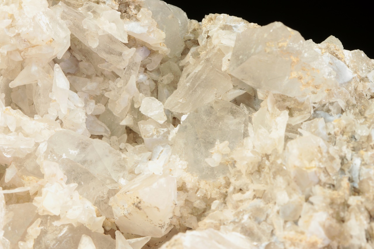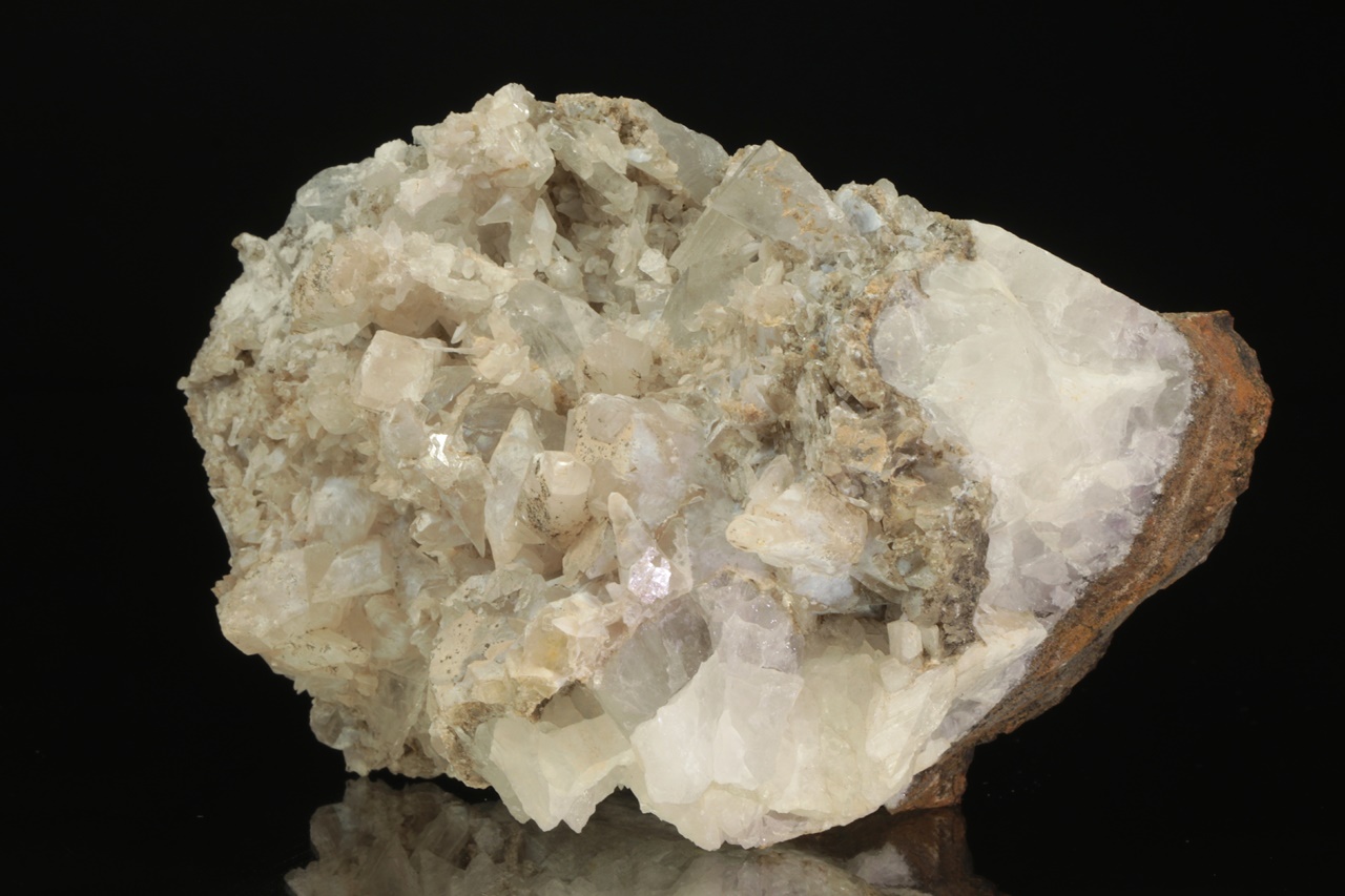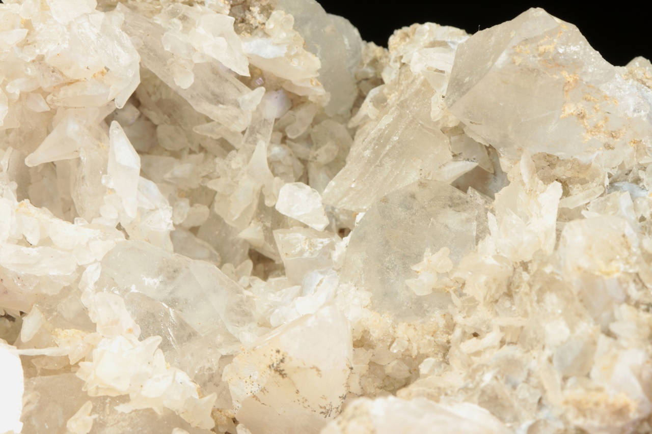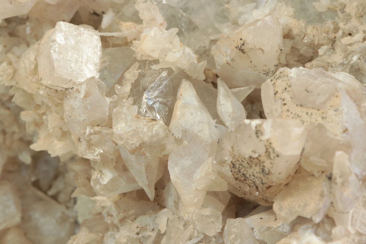 Velký vzorek protáhlých skalenoedrických krystalů bílého kalcitu narostlých na čirém křemeni.