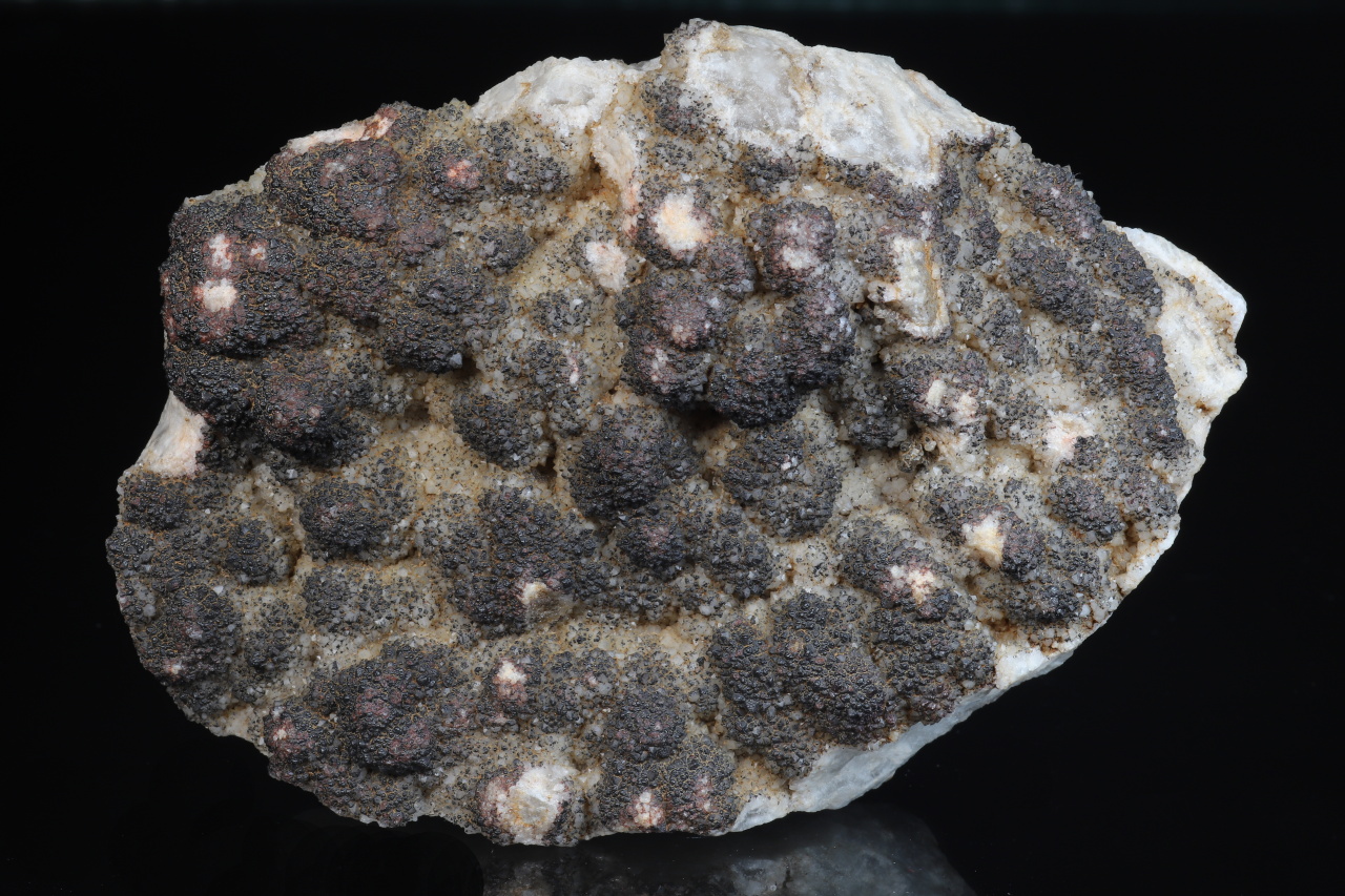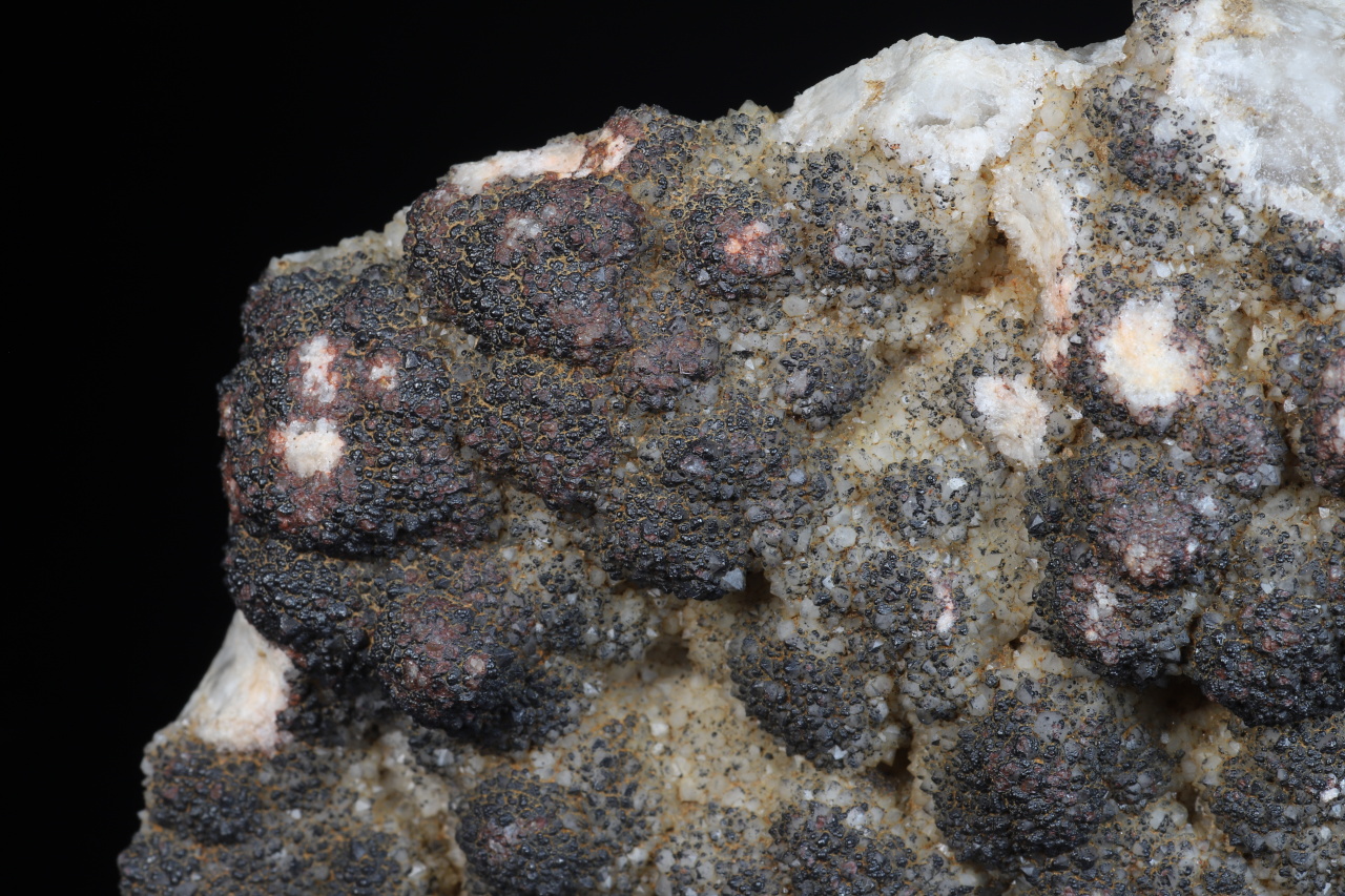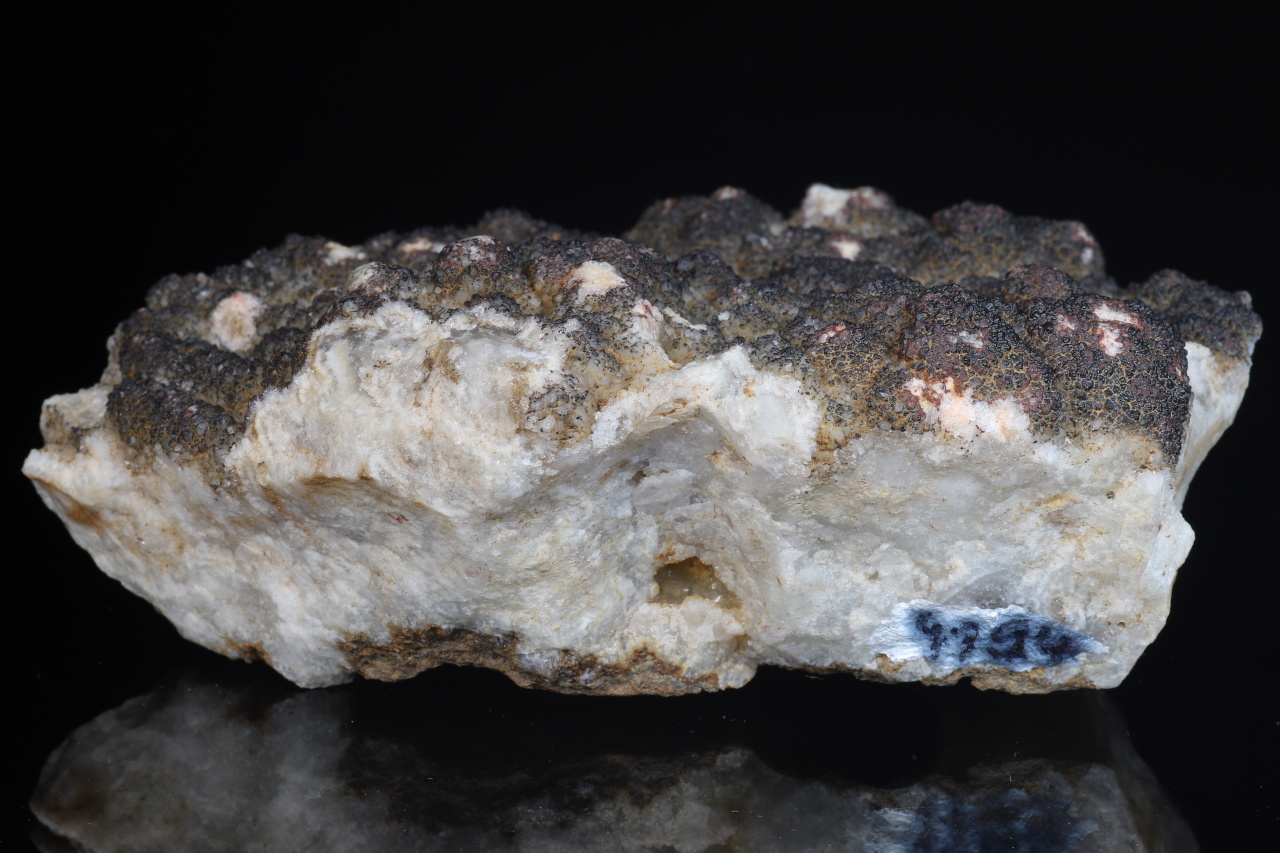 Část křemenné žíly s drobnými krystalky krápníčkovitého typu (tzv. bradavičník) ze zaniklého naleziště Strážník u Peřimova. Povrch krystalů je částečně pokrytý Mn či Fe oxidy.