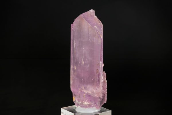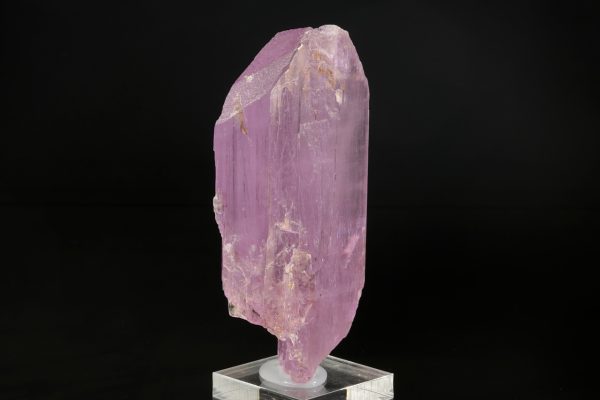 Nádherná ukázka nepoškozeného krystalu růžového průsvitného kunzitu drahokamové kvality s typickým prismatickým rýhováním.