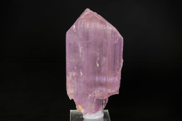 Nádherná ukázka nepoškozeného krystalu růžového průsvitného kunzitu drahokamové kvality s typickým prismatickým rýhováním.