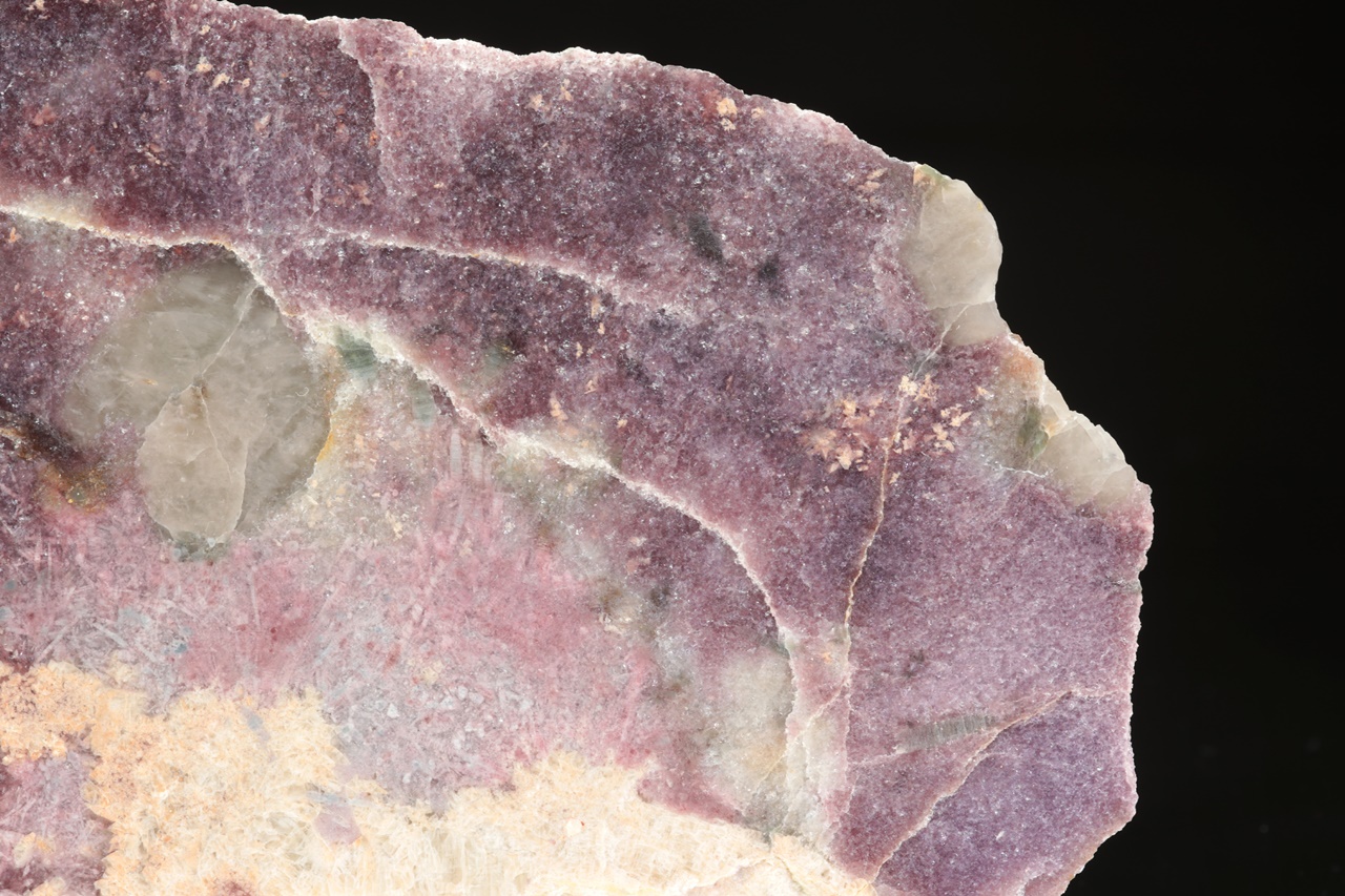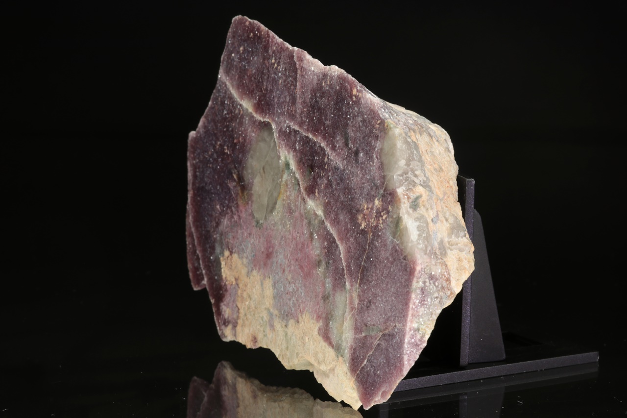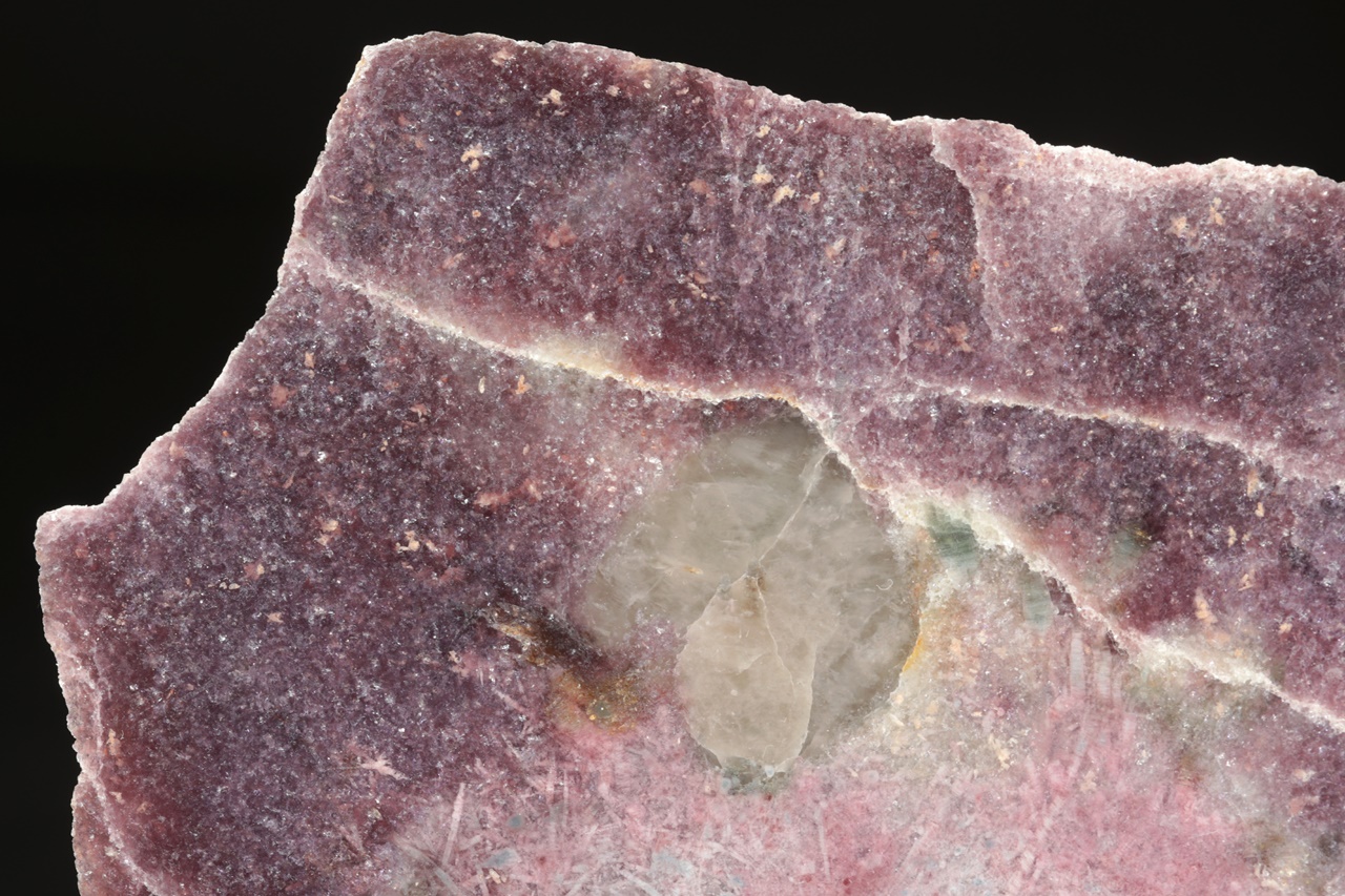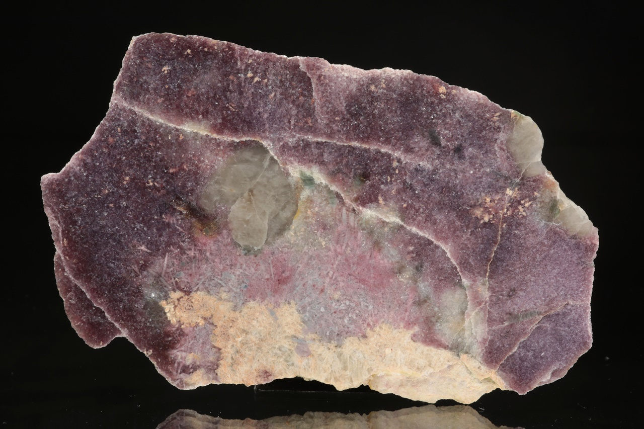 Leštěný vzorek masivního, velmi intenzivně fialového lepidolitu s růžovými stébly turmalínu.
