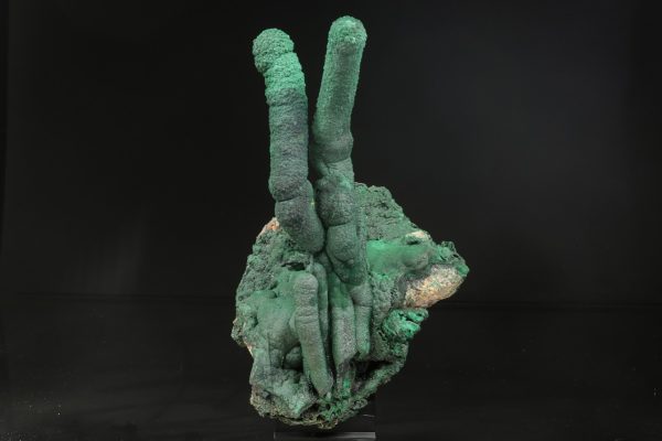 Dva neobvykle velké krápníky malachitu vyrůstající z podložky tvořené ledvinitými agregáty. Vzorek byl profesionálně opravený po té, co se odlomil pravý krápník. Nádherný vzorek sytě zeleného malachitu z vyhlášené lokality.